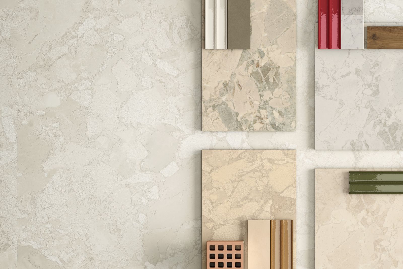 Arkigem amplia l’offerta in gres porcellanato con una rilettura espressiva del mondo lapideo, reinterpretando l’identità del Ceppo di Sicilia, un’elegante breccia calcarea. Il design è caratterizzato da frammenti eterogenei distribuiti in equilibrio, con una grafica profonda che ricorda le lavorazioni di acidatura e spazzolatura della pietra. Il modello offre cinque tonalità (Flora, Nube, Talco, Sabbia e Cappuccino) ed è adatto ad applicazioni indoor e outdoor, a pavimento e rivestimento, in formati che vanno dalla grande lastra (120×278 cm) al formato quadrato (120×120 cm).
