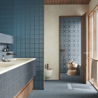 Terrasale contamina una basaltina compatta con frammenti di una limestone marina, arricchendo la superficie di dettagli materici puntinati. Sviluppata sul piccolo formato quadrato (20×20 cm), la collezione utilizza pigmenti colorati ed è impreziosita dal contrasto tra la superficie opaca del fondo e quella lucida dei decori in abbinamento, denominati Astro e Lacca.