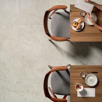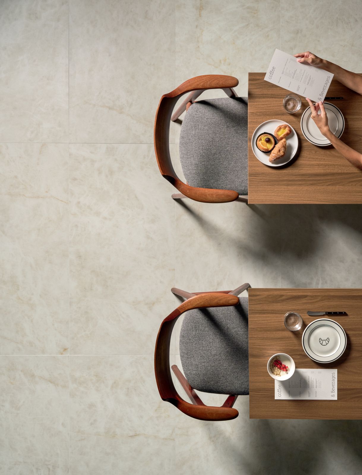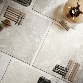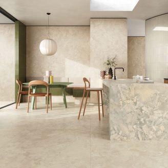 Arkigem amplia l’offerta in gres porcellanato con una rilettura espressiva del mondo lapideo, reinterpretando l’identità del Ceppo di Sicilia, un’elegante breccia calcarea. Il design è caratterizzato da frammenti eterogenei distribuiti in equilibrio, con una grafica profonda che ricorda le lavorazioni di acidatura e spazzolatura della pietra. Il modello offre cinque tonalità (Flora, Nube, Talco, Sabbia e Cappuccino) ed è adatto ad applicazioni indoor e outdoor, a pavimento e rivestimento, in formati che vanno dalla grande lastra (120×278 cm) al formato quadrato (120×120 cm).