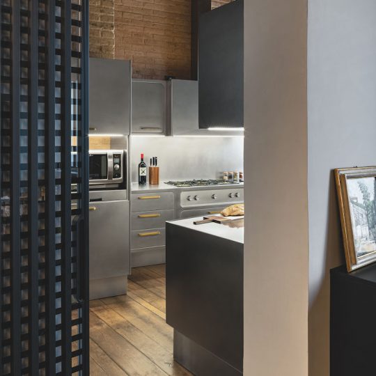 Interamente prodotta con acciaio AISI 304, Ego rivela ancora una volta la sua anima puramente sartoriale: la particolare forma trapezoidale dell’ambiente ha reso, infatti, necessario adattare la cucina alle specifiche esigenze del progetto e renderla, così, perfettamente proporzionata allo spazio.