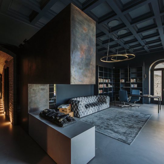 Sviluppata su più livelli, la villa è circondata da muretti ed elementi in pietra che si susseguono poi all’interno dei diversi spazi e si integra perfettamente nel paesaggio naturale che la accoglie.