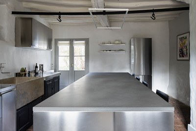 In questo contesto prestigioso l’ambiente dedicato alla cucina risulta protagonista del contesto abitativo come luogo confortevole e conviviale: per esaltare ancor più questo ambiente, l’architetto ha scelto la raffinatezza e l’eleganza di ATELIER di Abimis, posizionando al centro della cucina un grande modulo rettangolare in acciaio dotato di spazi contenitivi, che offre un ampio piano di appoggio, in pietra, e che all’occorrenza può essere utilizzato anche come tavolo.