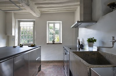 Il blocco adibito alla cottura è stato invece affiancato all’antico lavabo in pietra e per aumentare la funzionalità dello spazio le credenze e le madie originarie dell’Ottocento sono state rivestite anch’esse con piani in acciaio di Abimis e altre impreziosite dall’utilizzo della pietra serena.