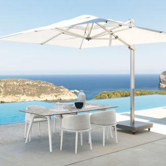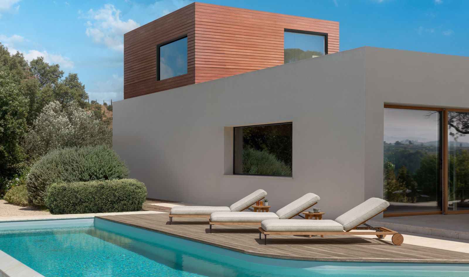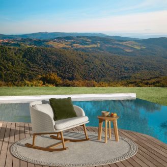 Per quanto riguarda le sedute, l’offerta parte dal divano modulare composto da due terminali rettangolari e due elementi lounge che permettono la massima libertà di combinazione. La struttura, che sia in legno o metallo, ha un carattere rigido e geometrico in totale contrasto con le ampie sedute composte da cuscini sfoderabili e quick dry foam. Tra le altre comode sedute c’è la poltrona Lounge dalla forma morbida e accogliente, la sedia a dondolo, l’altalena, il divano a baldacchino, DayBed, il divano Love Seat e la seduta Pozzetto. Non manca infine, per un relax in totale comodità, il lettino da giardino che riprende le linee geometriche del living. Nella versione in alluminio è disponibile anche matrimoniale.