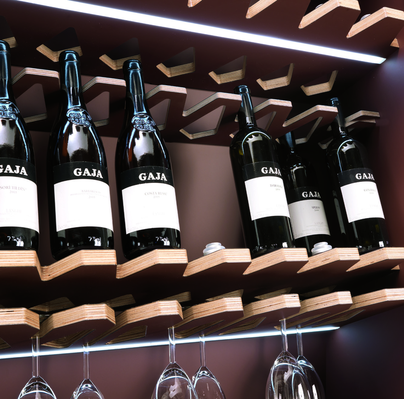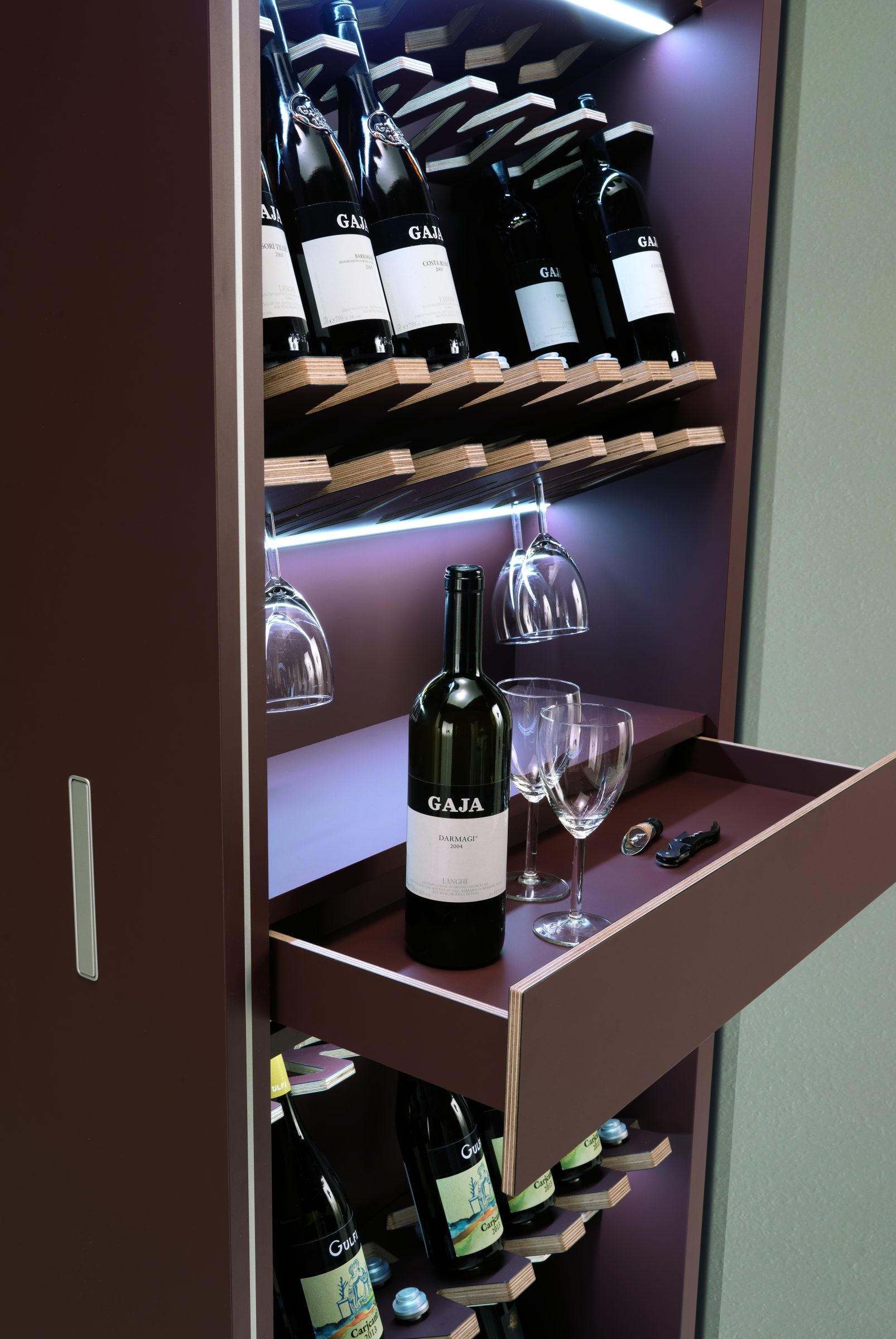 Il modulo si compone di 4 mensole sagomate ideali per custodire le bottiglie di vino, una mensola per alloggiare i bicchieri e un cassetto a chiusura ammortizzata utile per riporre gli accessori utili alla degustazione del vino. A questi elementi si possono aggiungere luci LED, prese elettriche e la possibilità di motorizzare l’apertura o la chiusura tramite apposito telecomando o App.