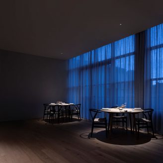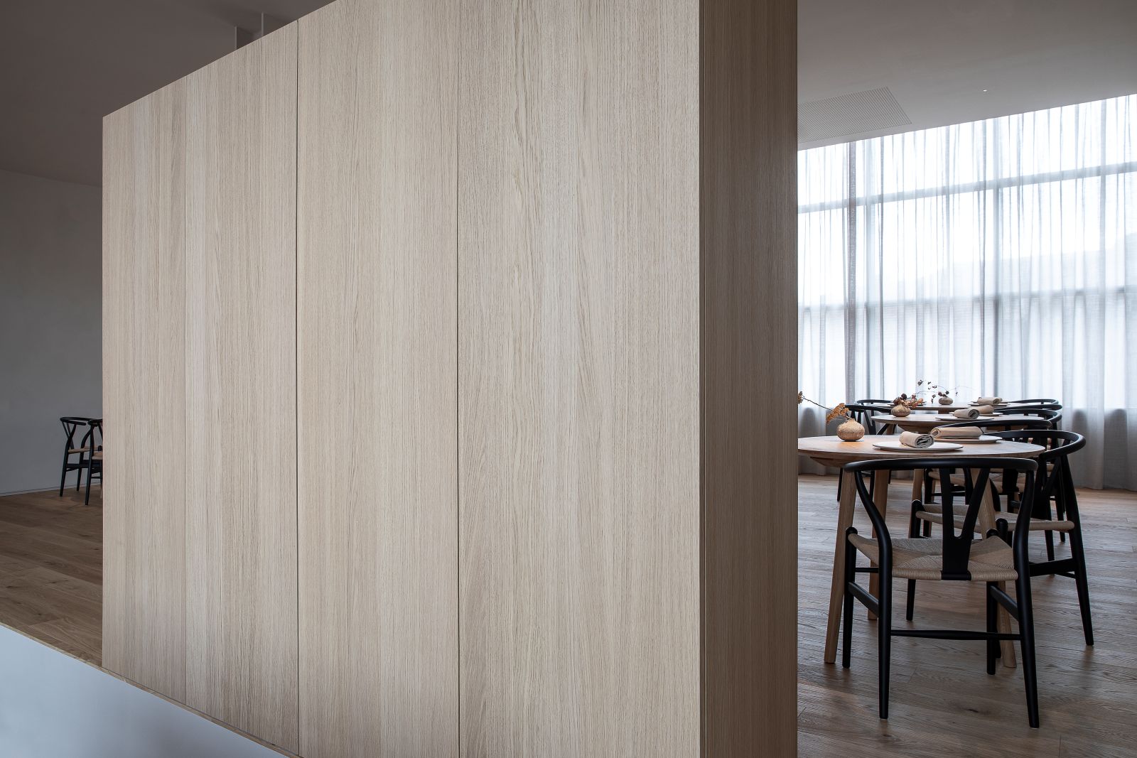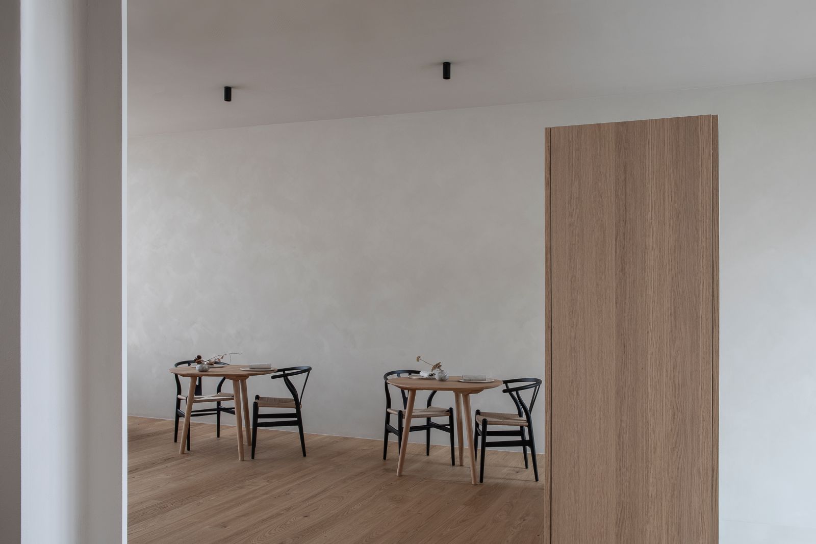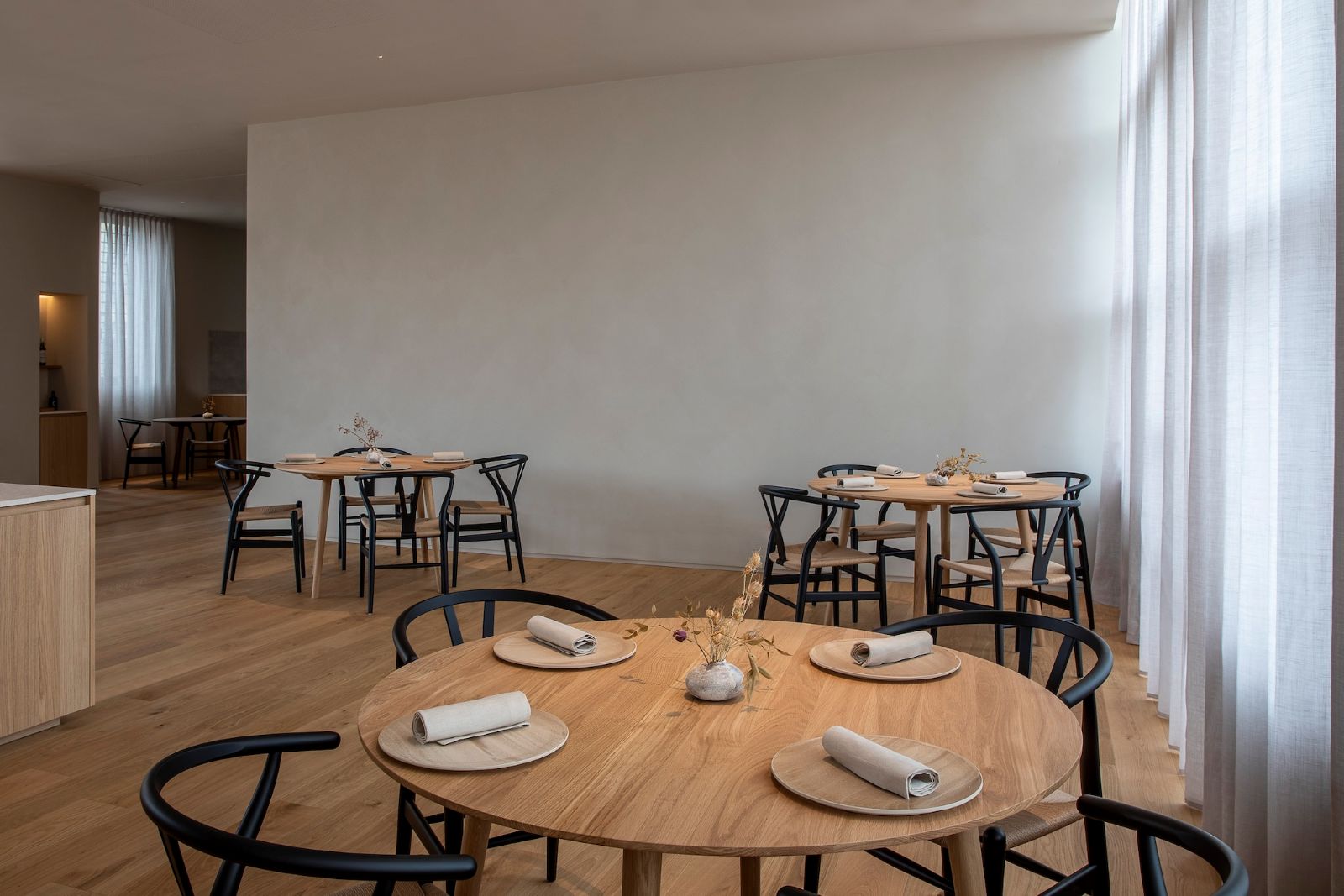 Protagonista indiscussa della sala è la CH24 Wishbone Chair, icona del 1949 disegnata da Hans J. Wegner. Per Abba Milano sono stati selezionati 28 esemplari nella finitura in faggio nero con seduta in corda naturale, che accompagnano gli otto tavoli in rovere della sala da pranzo. Ogni sedia richiede, per essere realizzata, oltre 100 passaggi manuali, un simbolo del savoir-faire artigianale danese che si sposa con la palette materica del ristorante, composta da pietra naturale, lino e legno di rovere.