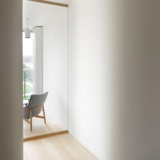 Il grande open space dell’azienda si svincola in due aree opposte. Al centro vi è un corner utilizzato come spazio multifunzionale e arredato con una poltrona Embrace. Il corner presenta una fila di tavoli di diverse dimensioni e altezze per assecondare le molteplici esigenze. Per questi ultimi sono state scelte le sedie CH33T di Hans J. Wegner, famose per la loro forma scultorea ed essenziale, insieme agli sgabelli da bar CH56 con gambe in legno massello dello stesso designer.
