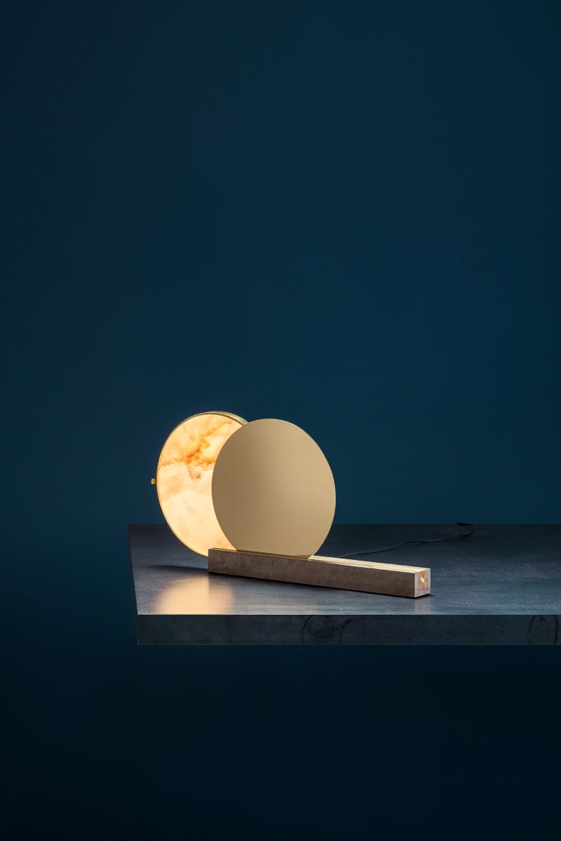 L’antitesi tra luce e buio, tra Sole e Luna, è stata la fondamentale fonte di ispirazione per la nuova lampada Alchemie T disegnata da Giulia Archimede per Catellani & Smith: una scultura preziosa composta da due dischi in ottone e alabastro, utilizzato per la prima volta in una creazione dell’azienda, che poggiano su una base realizzata in Pietra Medea.