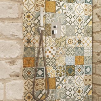 In questa ambientazione, dove i materiali naturali incontrano il design autentico, per l’area doccia è protagonista il soffione a parete ANTARES 2. Realizzato in acciaio inossidabile con finitura super-mirror, ugelli anticalcare e sistema easy-clean, vanta dimensioni generose (500×220 mm) e offre due modalità di getto: la pioggia avvolgente e la cascata energizzante. ANTARES 2 è completato dalla doccia a mano geometrica LEO (23×23 mm) in ABS anticalcare, flessibile coordinato e miscelatore a due vie.