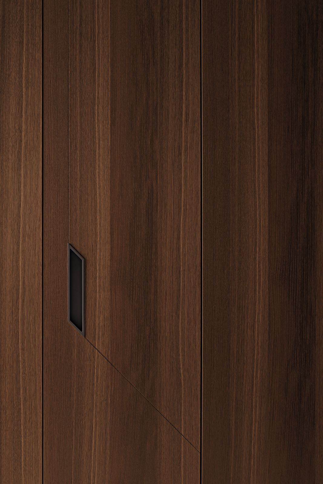 L’anta Dandy di Zanette è una soluzione a battente caratterizzata dall’originale maniglia a incasso, a forma trapezoidale, che nel suo prolungamento del lato sinistro e inferiore crea un ulteriore motivo decorativo sulla superficie del pannello. Questo può essere in legno rovere termocotto o con finitura laccata opaca, che definisce anche l’elemento maniglia, tono su tono o a contrasto.