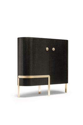 La collezione comprende credenza, mobile bar, porta TV, toilette e comodino: i profili arrotondati interagiscono con la lineare ed esile struttura metallica delle gambe, mentre materiali come metallo, legno, tessuto e marmo delineano sofisticati contrappunti materici che avvolgono ogni pezzo.