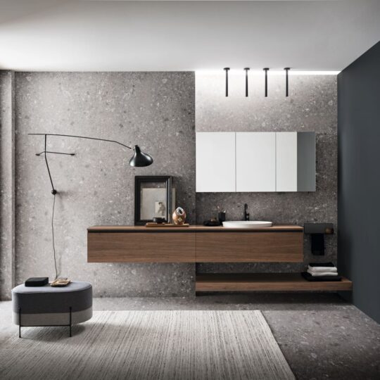 Altrettanto affascinanti sono poi le altre proposte di Dress: i vani a giorno con vassoio in metallo, i lavabi in appoggio oppure integrati nel piano con effetto Pietra a spacco, l’originale porta-rivista.