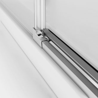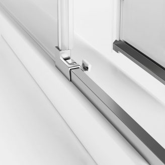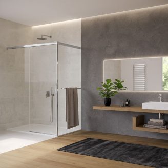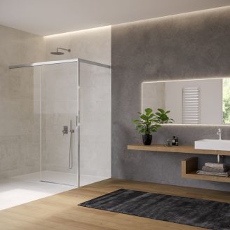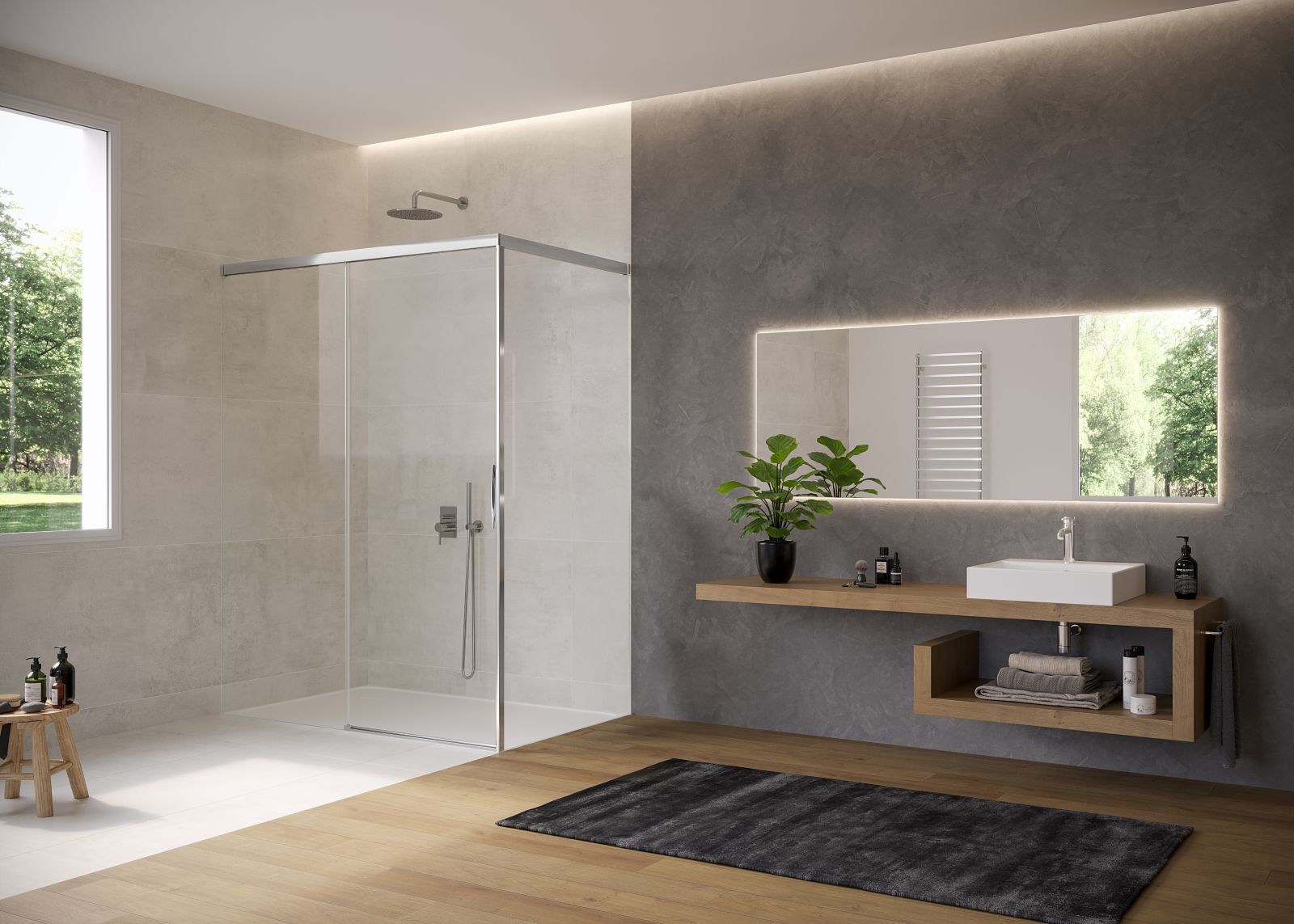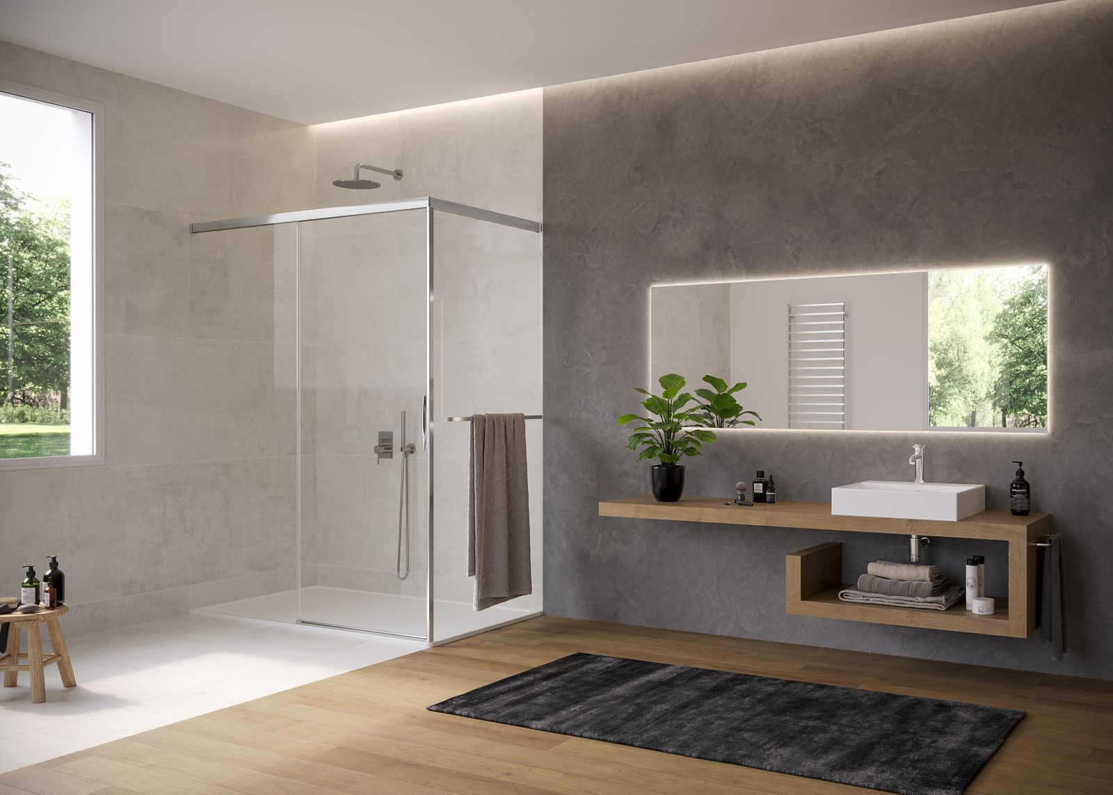 La nuova proposta punta a ridurre drasticamente l’impatto visivo del box doccia, rafforzandone la continuità con lo spazio bagno circostante. L’eliminazione del profilo verticale permette di fissare il vetro direttamente alla parete tramite elementi di supporto discreti, lasciando che sia la superficie cristallina a dominare la scena. Anche i componenti orizzontali sono stati rivisti: il design si fa più “morbido” e lo spessore del profilo magnetico si riduce per alleggerire l’estetica complessiva. Un dettaglio tecnico di pregio è il giunto angolare superiore con taglio obliquo, studiato per unire le componenti con estrema precisione.
