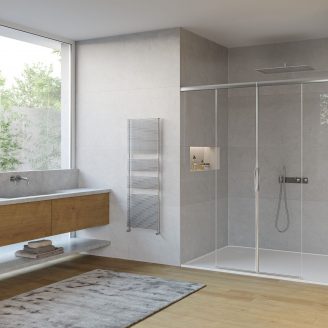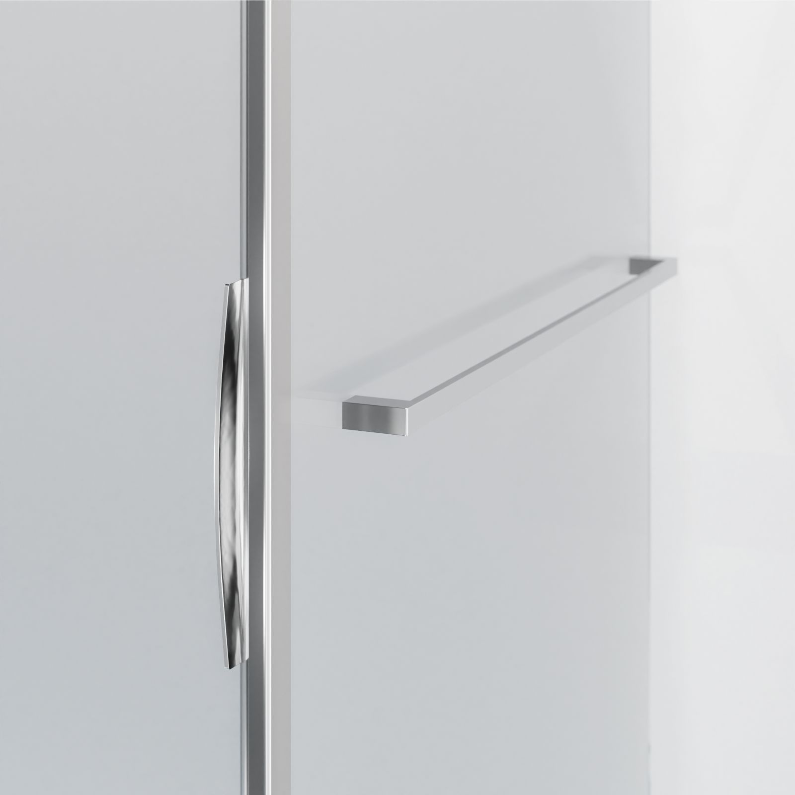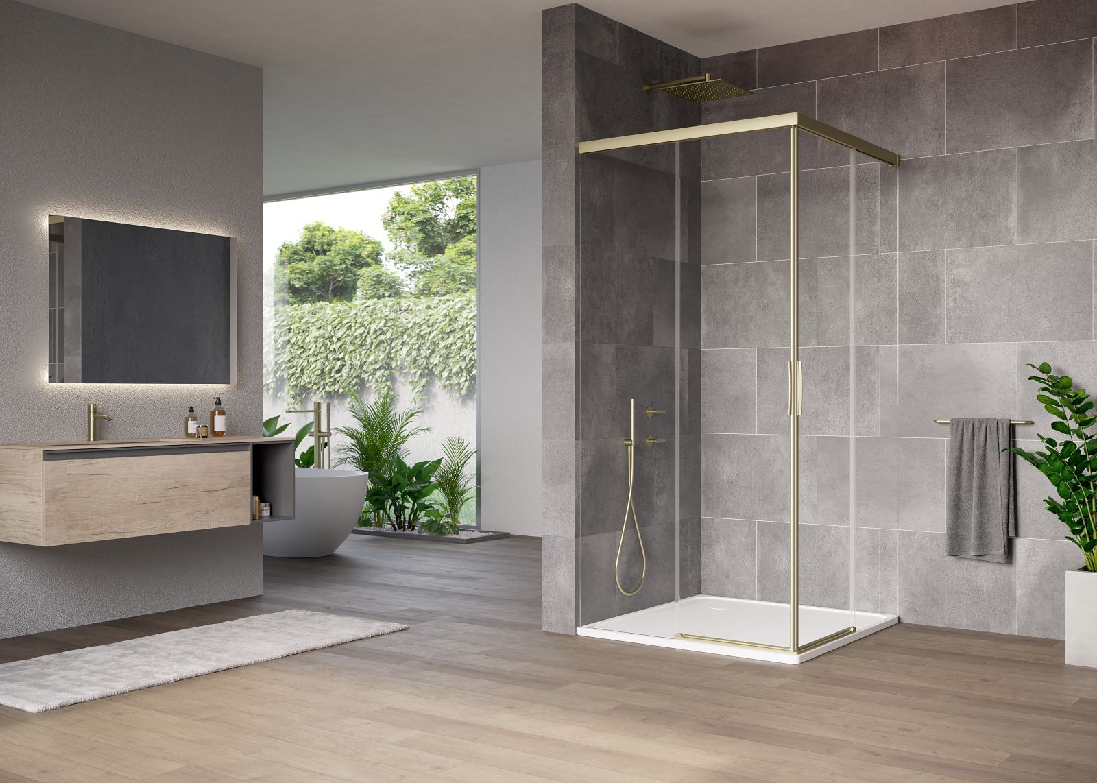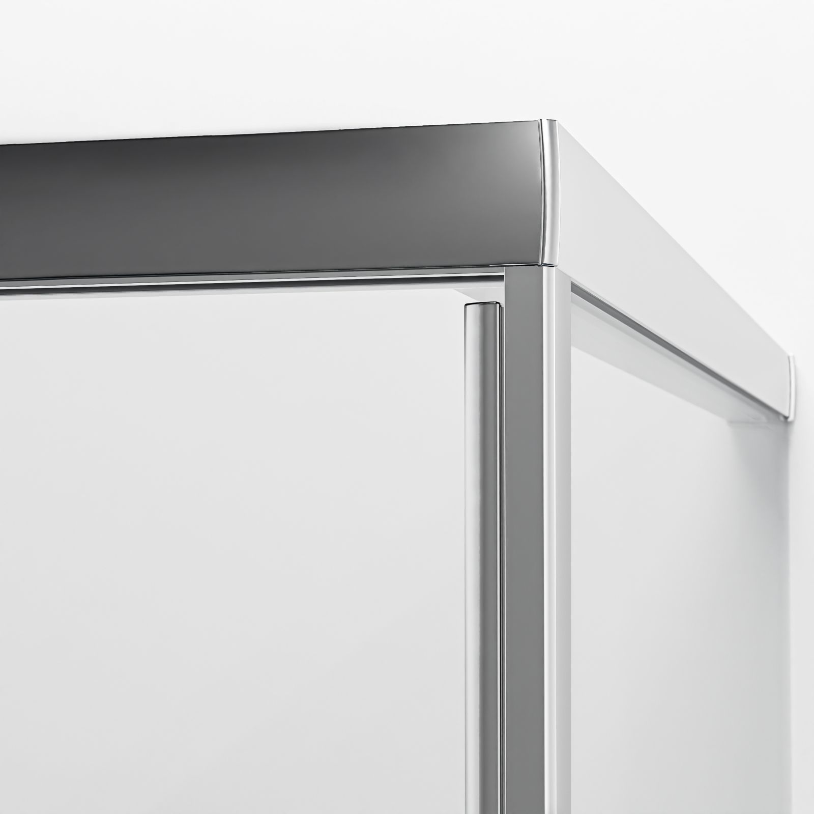 La nuova proposta punta a ridurre drasticamente l’impatto visivo del box doccia, rafforzandone la continuità con lo spazio bagno circostante. L’eliminazione del profilo verticale permette di fissare il vetro direttamente alla parete tramite elementi di supporto discreti, lasciando che sia la superficie cristallina a dominare la scena. Anche i componenti orizzontali sono stati rivisti: il design si fa più “morbido” e lo spessore del profilo magnetico si riduce per alleggerire l’estetica complessiva. Un dettaglio tecnico di pregio è il giunto angolare superiore con taglio obliquo, studiato per unire le componenti con estrema precisione.