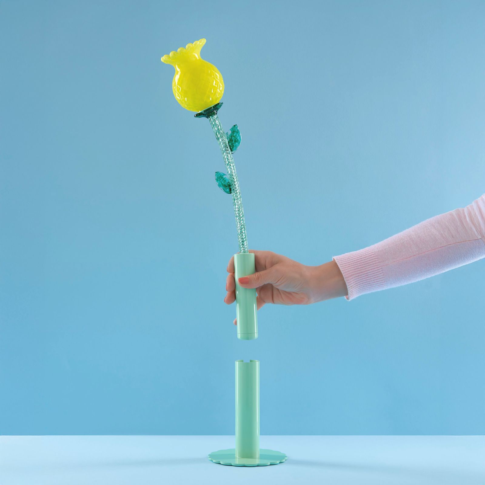 Il fiore si trasforma in una lampada da tavolo che si accende magicamente non appena viene inserito nell’apposito vaso e i due elementi entrano in contatto. Grazie alla sorgente LED incastonata al centro della corolla, ogni creazione diffonde una luce lieve e soffusa.