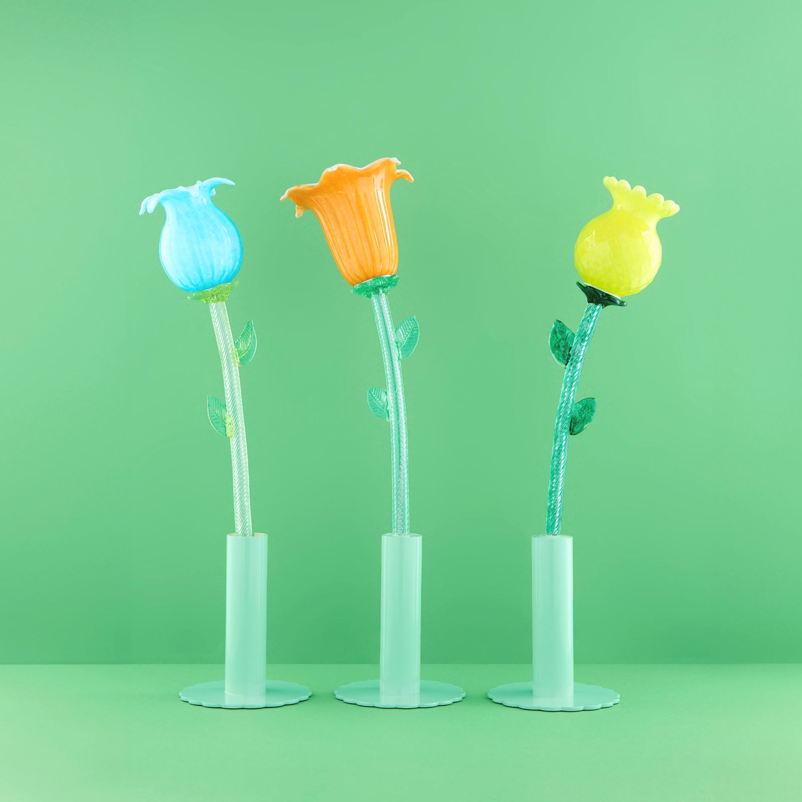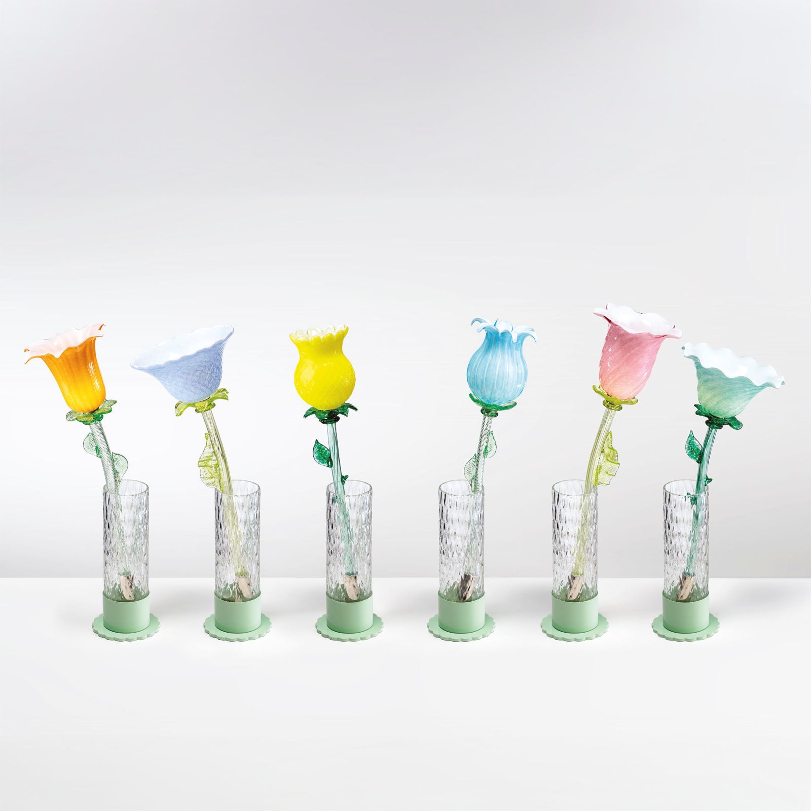 Ogni fiore, realizzato in sei varianti di forma e colore, è impreziosito da particolari texture che nascono dalla soffiatura e dalle lavorazioni tradizionali del vetro di Murano, eseguite dalle sapienti mani dei maestri di Multiforme. Le linee fluide dello stelo e le proporzioni tondeggianti del bocciolo conferiscono tridimensionalità e profondità alla composizione, con un effetto armonico.