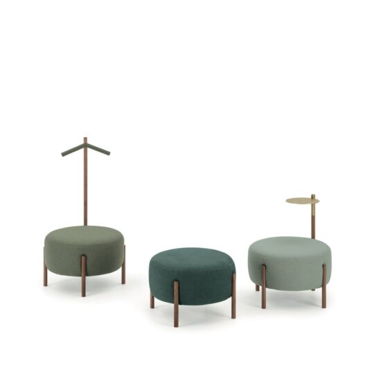 Il pouf e la poltroncina dalla forma accogliente e le dimensioni contenute possono infine essere integrati con il vassoio; il pouf è poi completabile con la gruccia che lo trasforma in servomuto.