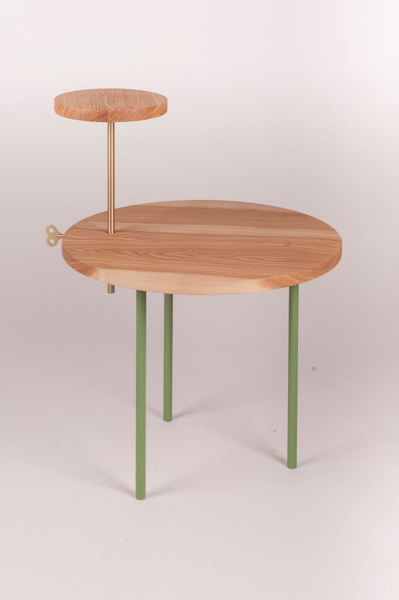 Ettore è invece il side table in frassino, acciaio e ottone progettato dall’art director Leonardo Fortino: un piano circolare in legno, posto in risalto dal contrasto materico con gli appoggi metallici, è sormontato da un pianetto di dimensioni più contenute, la cui altezza può essere regolata tramite una chiavetta d’ottone, elemento estetico e al tempo stesso funzionale, posta lungo la circonferenza del tavolo; componente apparentemente fuori contesto, la chiave da ricarica impreziosisce il tavolino, trasformandolo in un oggetto che appartiene pienamente al presente e al tempo stesso in grado di richiamare gli echi di un mondo passato.