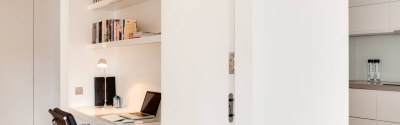 Lo studio, in collaborazione con il socio Mike Neale, ha scelto in particolare HI-MACS® nella tonalità Alpine White per dare vita a un elemento fondamentale per la definizione e la separazione degli ambienti, completamente ridisegnati: un blocco centrale che nasconde al suo interno una pratica postazione home office, con scrivania e mensole in solid surface con illuminazione LED integrata.