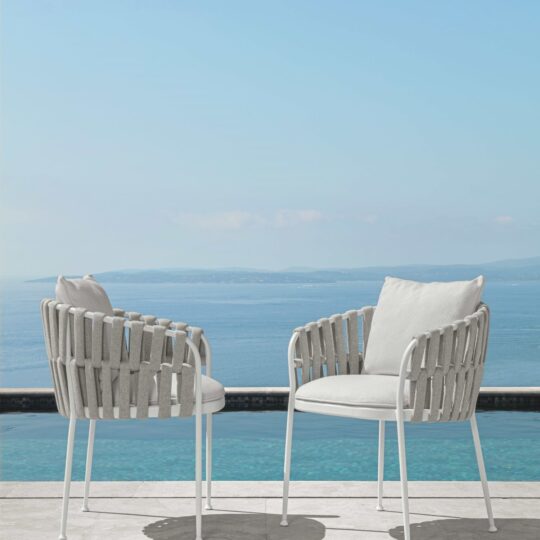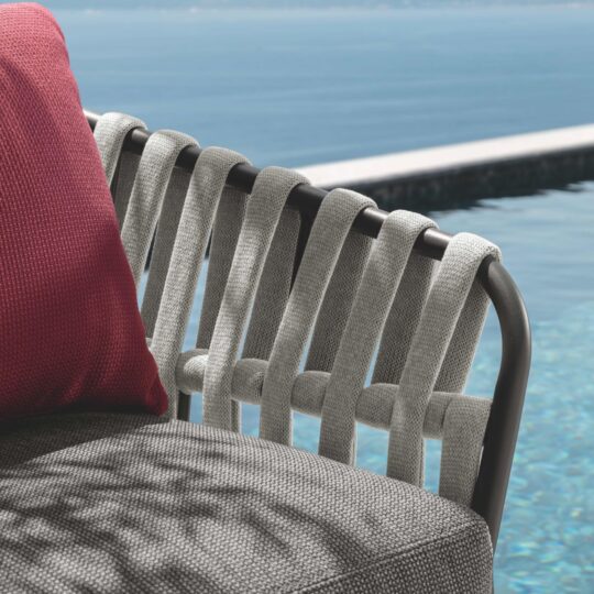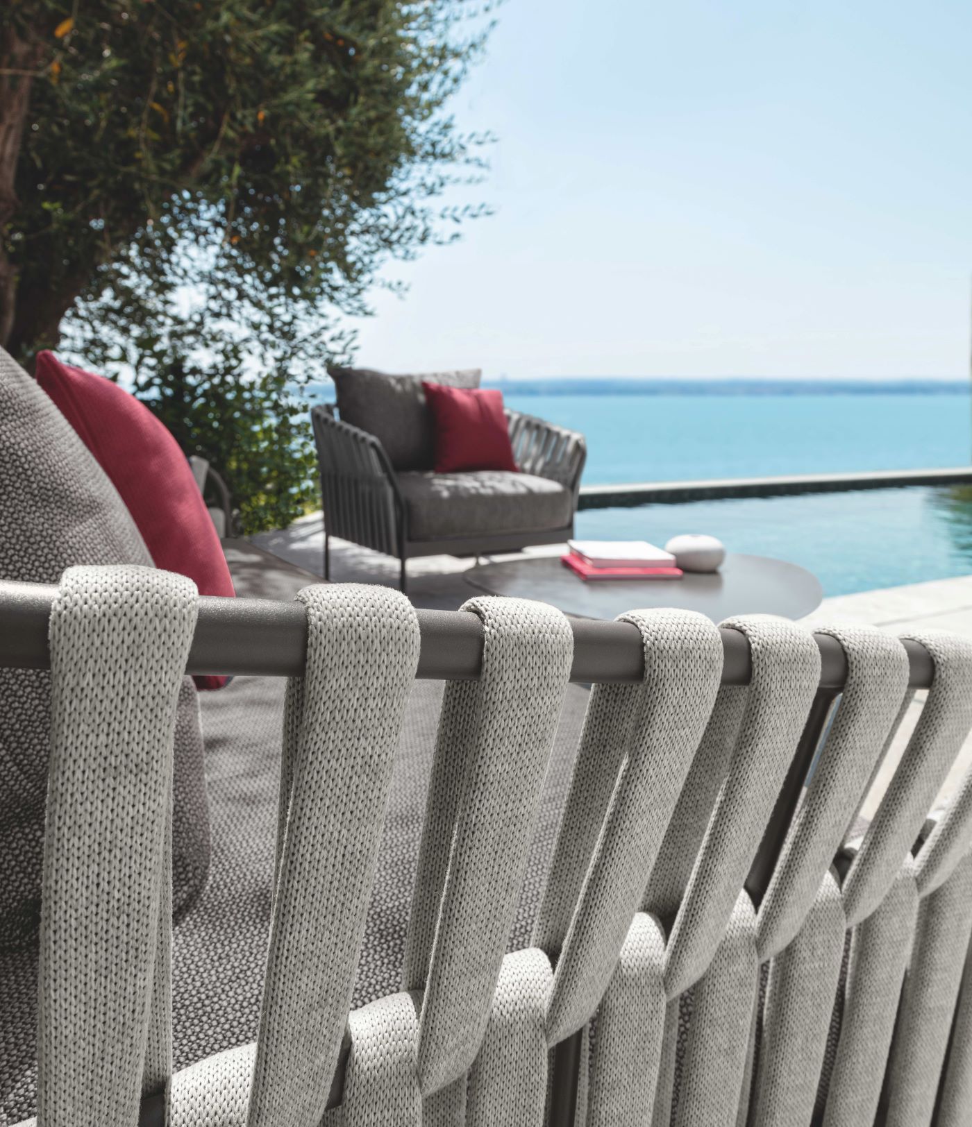L’intreccio della corda imbottita sulla struttura tubolare crea una finestra reticolata che regala affascinanti giochi di luce quando i raggi si posano sulle fessure; i volumi leggeri e sensuali garantiscono infine un perfetto relax outdoor e per un’ottima privacy visiva.