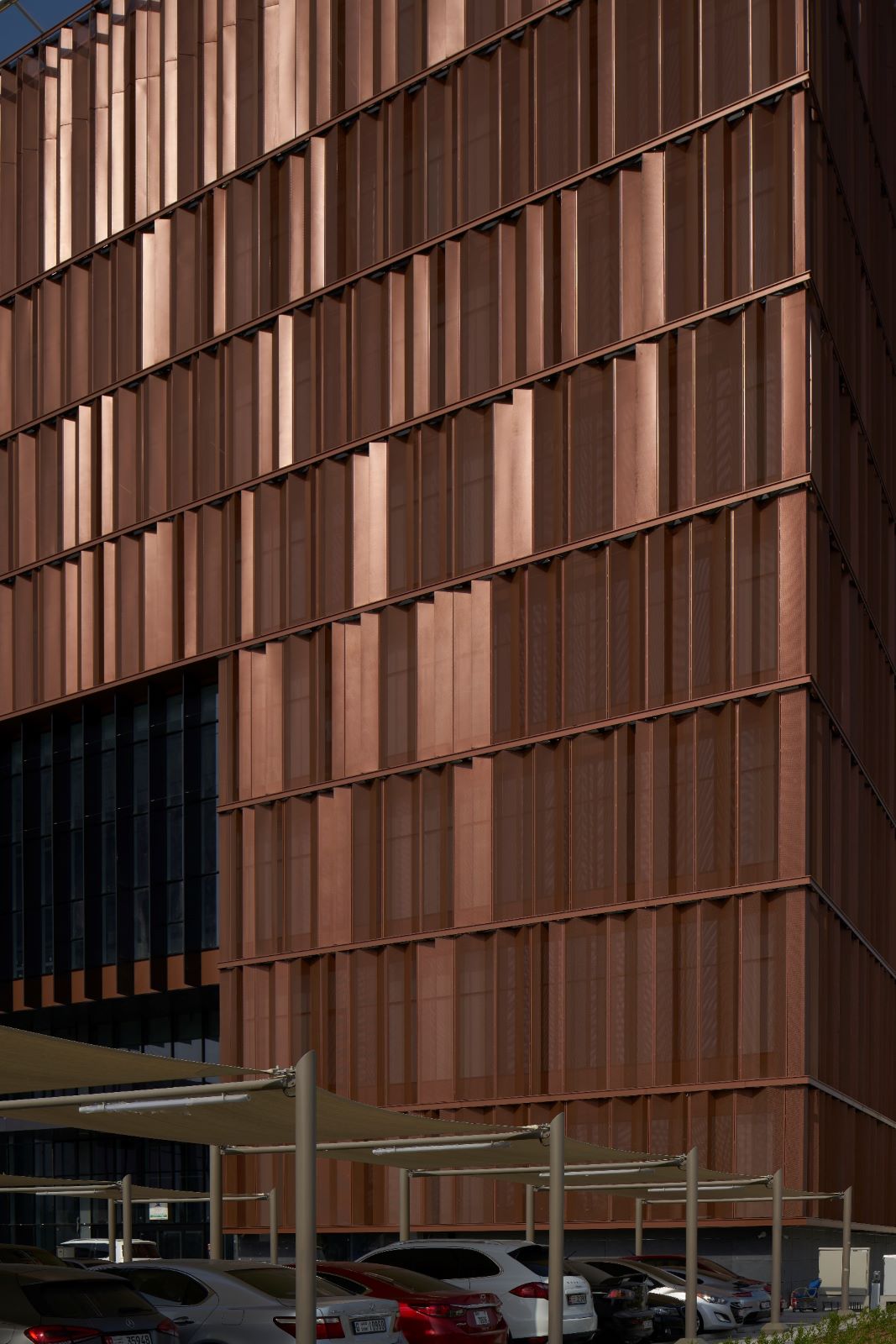 La struttura architettonica ha una forma squadrata e geometrica a parallelepipedo e si allunga lateralmente grazie alle gallerie che la collegano con le aree esterne. Se l’ampio ingresso è formato da vetrate libere, le altre facciate sono state leggermente nascoste da pannelli frangisole di rete metallica che riducono la percentuale della luce solare negli ambienti interni e forniscono ombra senza dividere la visuale esterna.