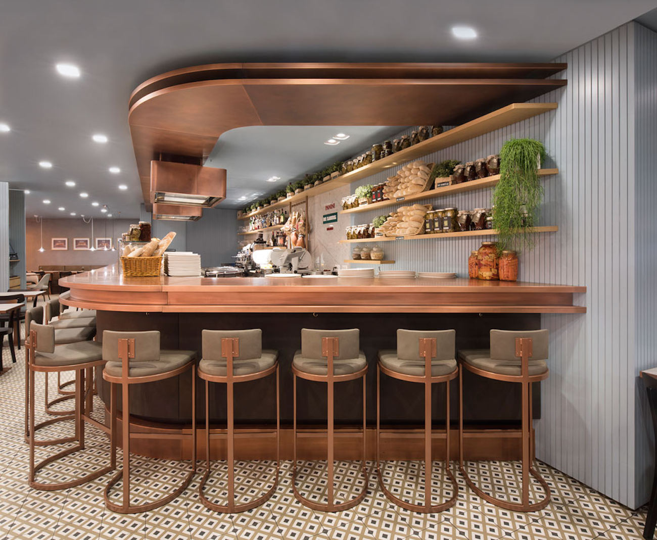 L’ambiente si sviluppa così attorno al grande banco in rame e pelle che con una sinuosa forma accoglie i clienti provenienti dai diversi accessi del locale; protagonisti sono le leggere lampade Semi Pendant di Gubi e il gioco ottico creato dal disegno geometrico delle piastrelle utilizzate per le pavimentazioni.