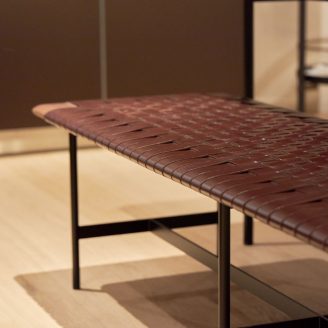 Puntando su materiali naturali e preziose lavorazioni artigianali, Ritzwell presenta qui alcuni modelli rappresentativi del suo catalogo, disegnati da Shinsaku Miyamoto. La zona pranzo, ad esempio, prende forma con l’MT TABLE, caratterizzato da sottili gambe in metallo e piano in legno di noce massello dal profilo leggermente arrotondato, e la MT BENCH composta da seduta in fasce di cuoio e struttura in acciaio e noce massello.