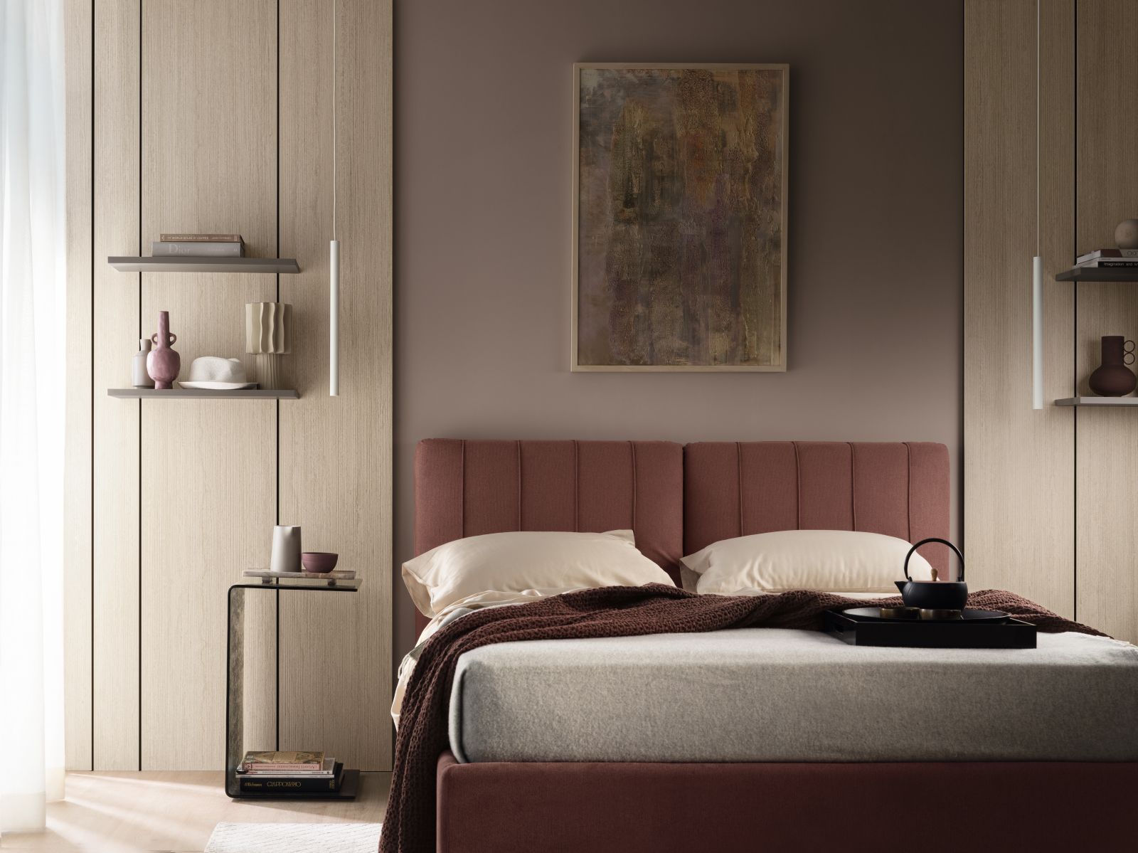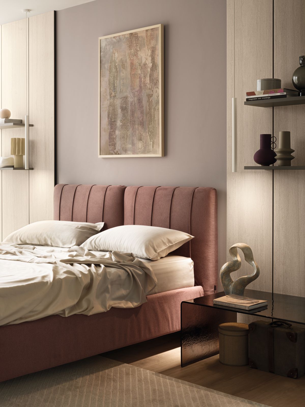 Olimpia e Sarin sono i primi due modelli della collezione. Olimpia è l’incontro tra eleganza classica e comfort moderno. La testata imbottita con profili cordonati verticali crea un raffinato ritmo visivo che valorizza la parete. Disponibile in una ricca gamma di rivestimenti, dai tessuti naturali ai velluti più sofisticati, e nelle versioni con o senza contenitore salvaspazio, è ideale per chi desidera un ambiente funzionale.