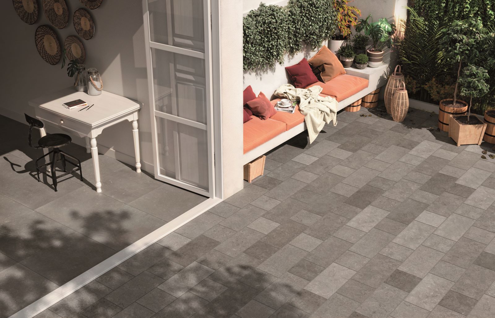 La posa su ghiaia si rivela la soluzione ideale sulle superfici dove non è applicabile una pavimentazione definitiva, poiché permette di mantenere inalterato il drenaggio del terreno, attraverso la fuga tra le lastre, consentendo il deflusso delle acque in falda. Con la funzione di preservare il manto erboso, consentendo di viverlo senza rovinarlo con pesi o calpestii, la posa in appoggio su erba è indicata per camminamenti e aree pubbliche o residenziali. Al contrario della posa su massello con colla che, grazie alla superficie estremamente resistente sia ai carichi dinamici che concentrati, è adatta a rivestire aree carrabili o parcheggi in esterno. La posa sopraelevata per outdoor, invece, sfrutta il sistema tradizionale dei pavimenti flottanti, o sopraelevati, trasformando il rivestimento in grès in un pratico passaggio di impianti e tubazioni che, grazie alla possibilità di sollevare ed eventualmente rimuovere le lastre, ne permette anche un’accessibilità immediata.