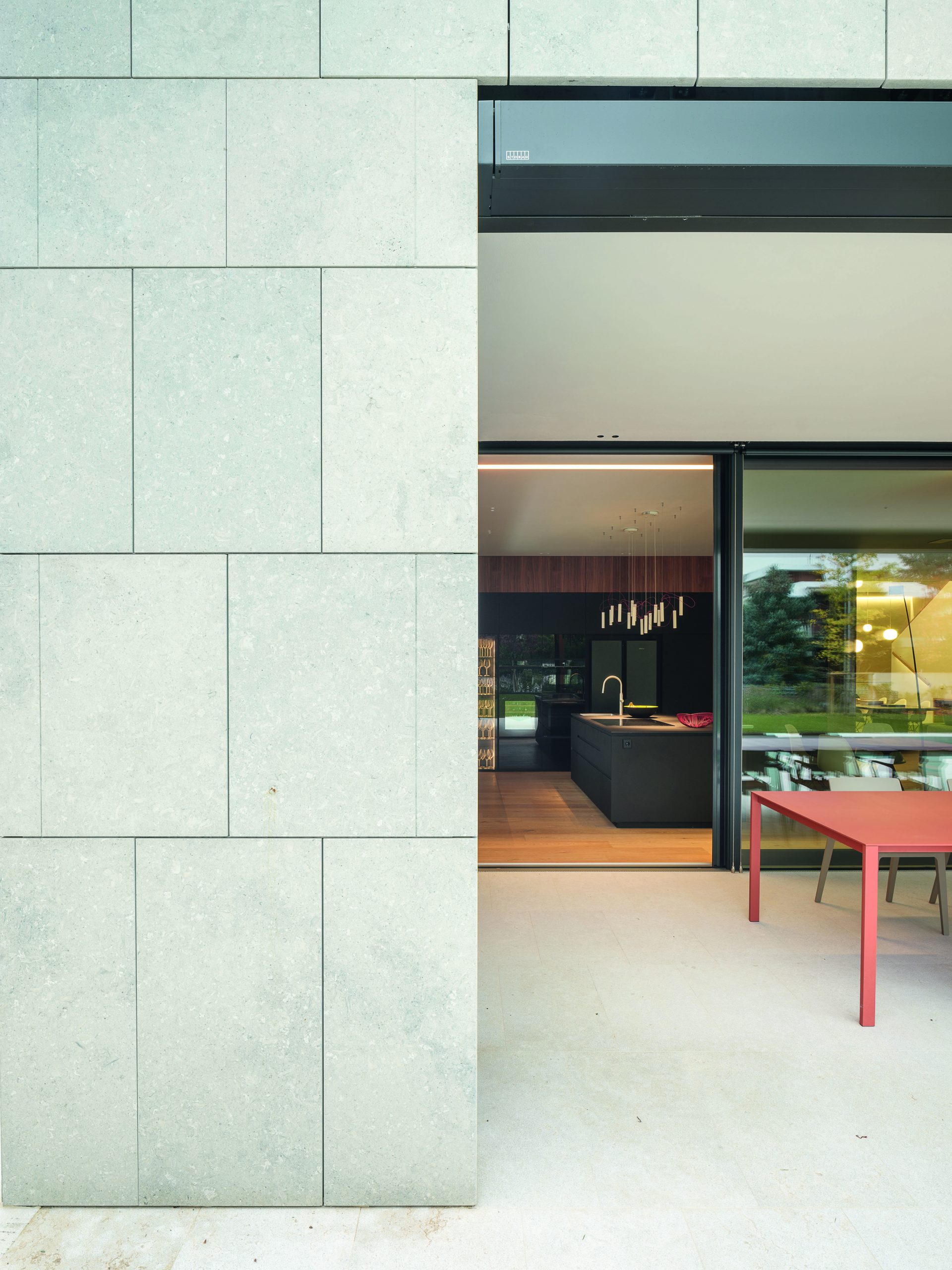 All’esterno, la villa si presenta con un carattere risoluto grazie a un sistema di rivestimento ventilato realizzato in lastre di Grigio Alpi spesse tre centimetri. Questa soluzione tecnica non è solo una scelta di prestigio estetico, ma garantisce alla residenza un’elevata efficienza termica e una perfetta traspirabilità, eliminando i problemi di condensa e umidità.