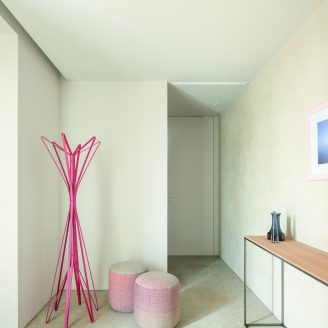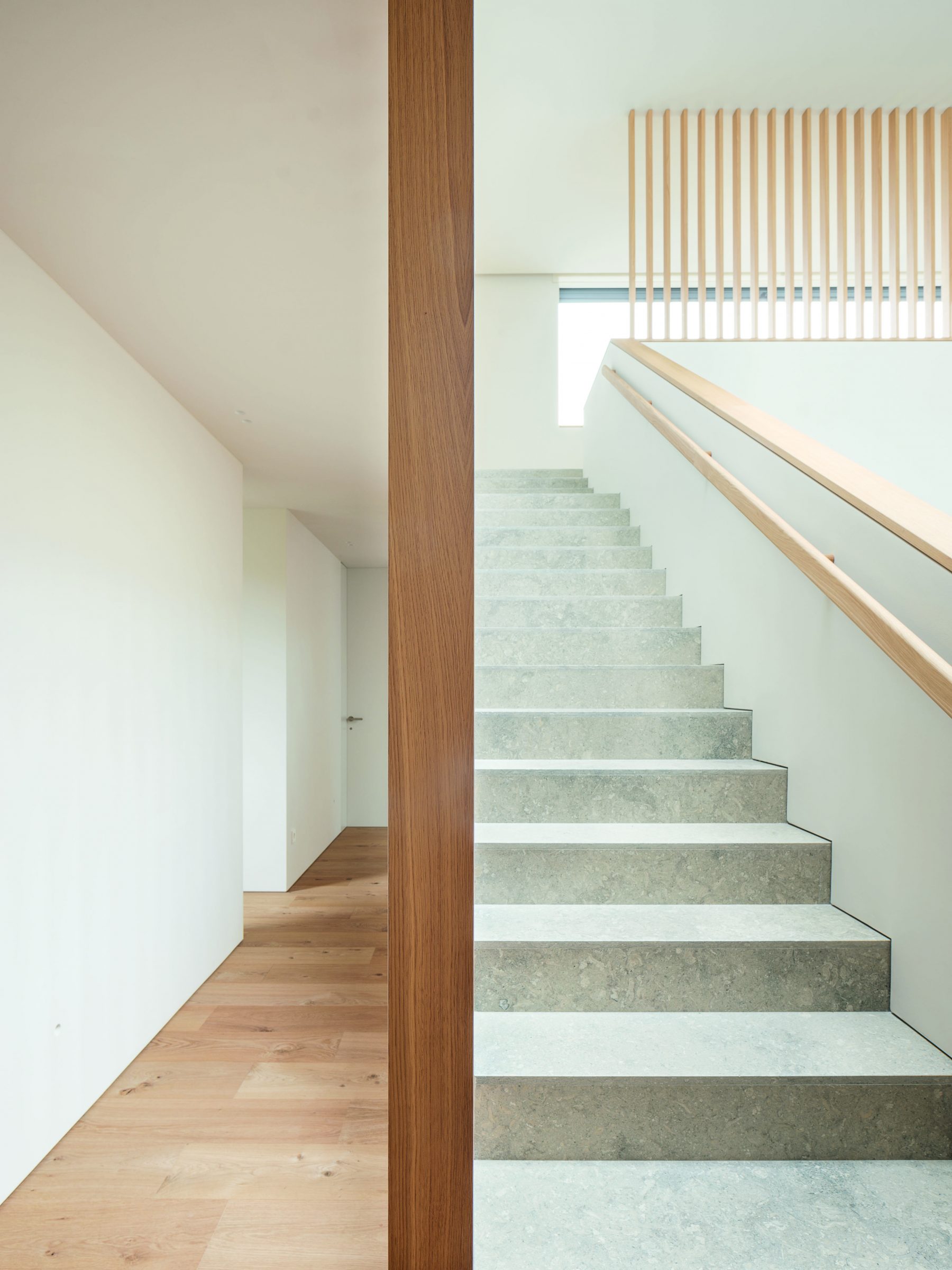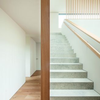 La pietra, caratterizzata da un tono grigio chiaro punteggiato da suggestivi macrofossili, assicura una forte continuità visiva tra gli spazi aperti e quelli chiusi. Entrando, il Grigio Alpi continua a dominare la scena: le pavimentazioni in marmette levigate, posate con cura a casellario, dilatano la percezione spaziale. Il materiale si estende con naturalezza fino alle superfici dei bagni, dove le lastre tagliate su misura avvolgono l’ambiente con un linguaggio raffinato e coerente. Il culmine della ricerca materica si raggiunge nella scala monolitica che connette i livelli della villa. Interamente rivestita in Grigio Alpi, la struttura appare come un blocco unico, una vera scultura architettonica in cui il sistema di giunzione tra alzate e pedate scompare, lasciando parlare solo la forza del materiale.