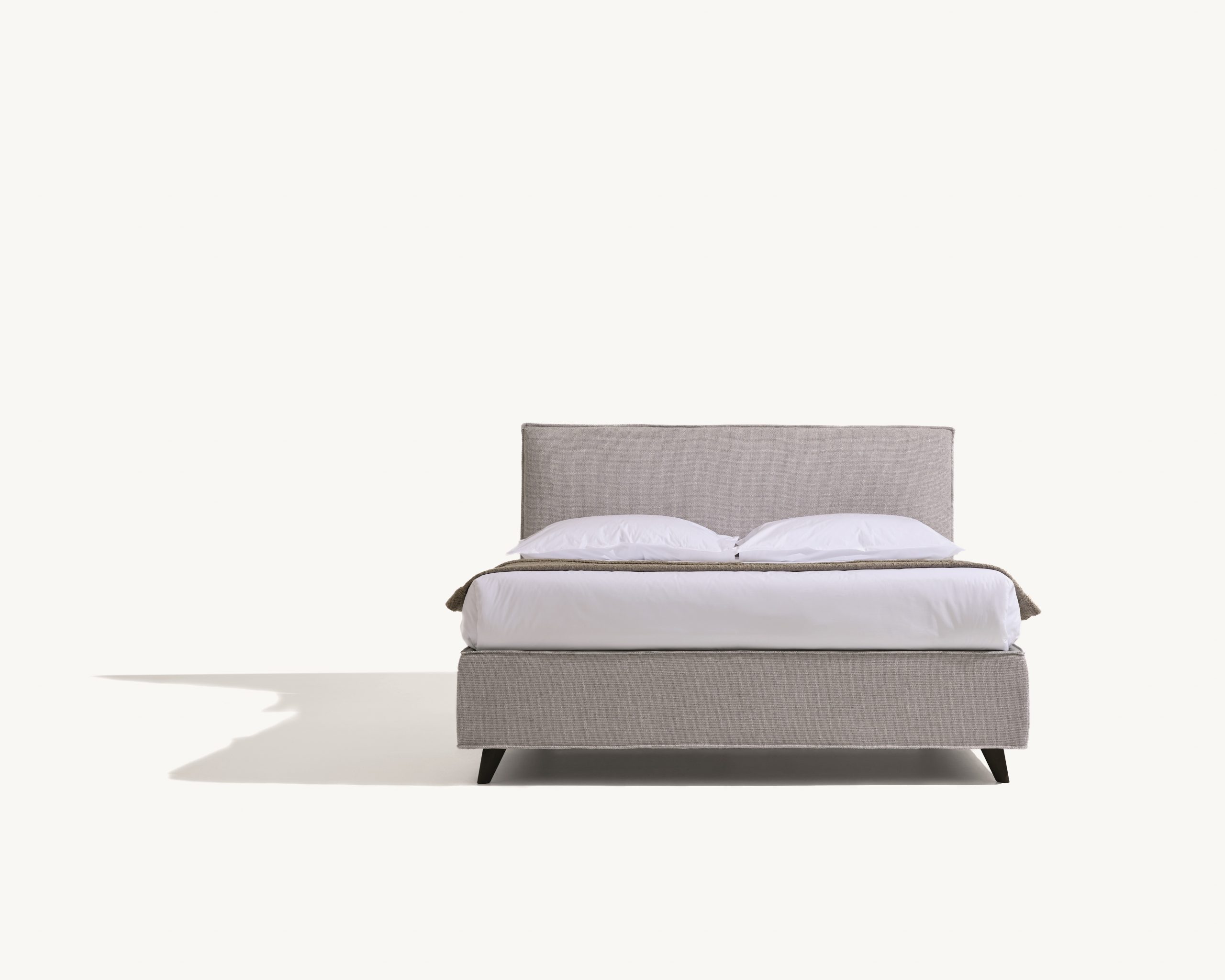 Per chi predilige invece un design più deciso e compatto, Vesuvio offre una soluzione dove la pulizia formale incontra una geometria scultorea. La testata si presenta come un unico, ampio cuscino senza interruzioni, leggermente ricurvo ai lati per accogliere e sostenere il riposo in ogni istante, anche durante una breve pausa di relax. Questo modello si caratterizza per il rigore del giroletto integrato e per i piedi inclinati in metallo con taglio laser, anch’essi declinabili in sei varianti cromatiche. La straordinaria libertà di personalizzazione consente di combinare rivestimenti differenti tra testiera, struttura e giroletto, permettendo di creare un letto su misura che può includere, se desiderato, il vano contenitore senza minimamente alterare l’equilibrio estetico del progetto.