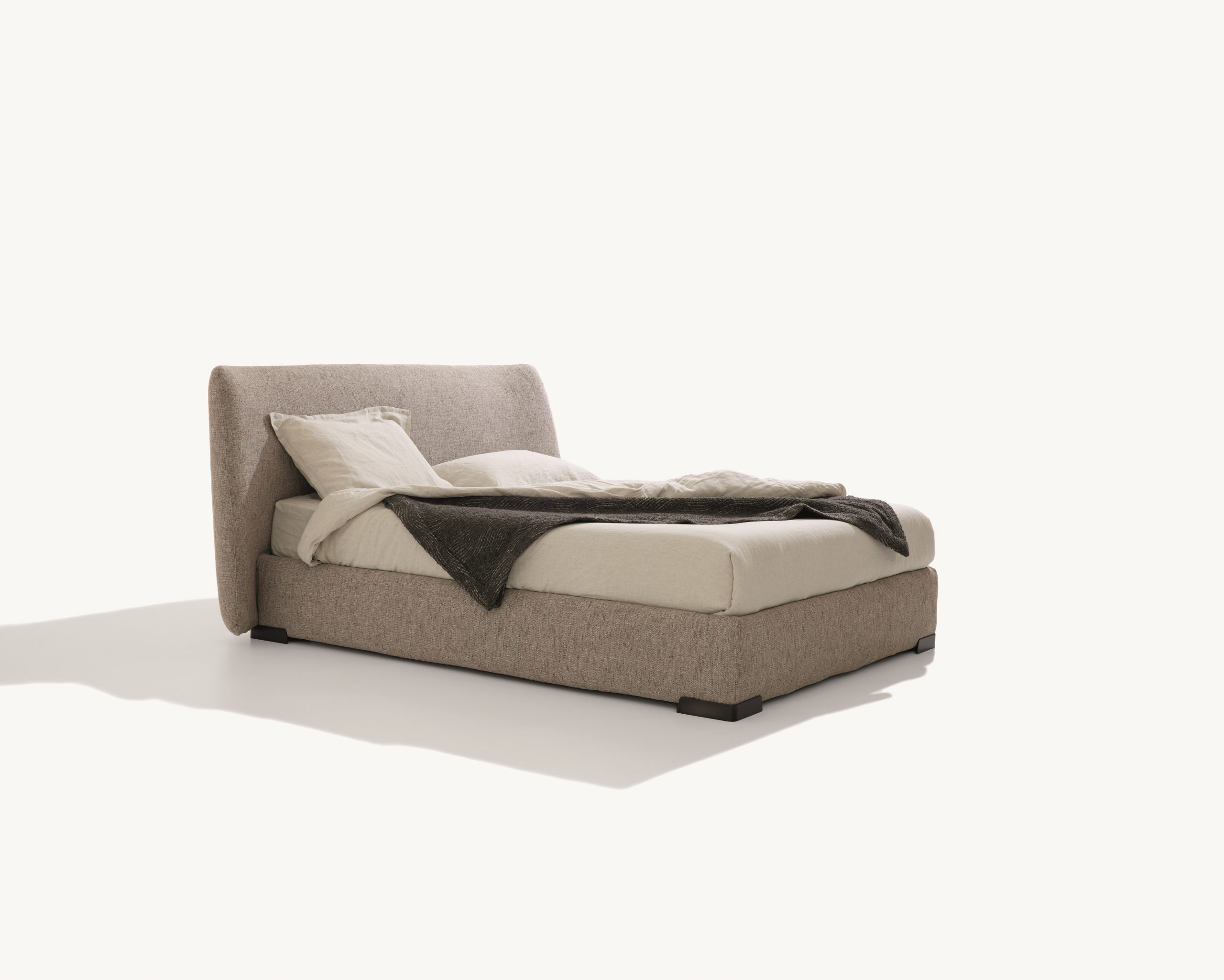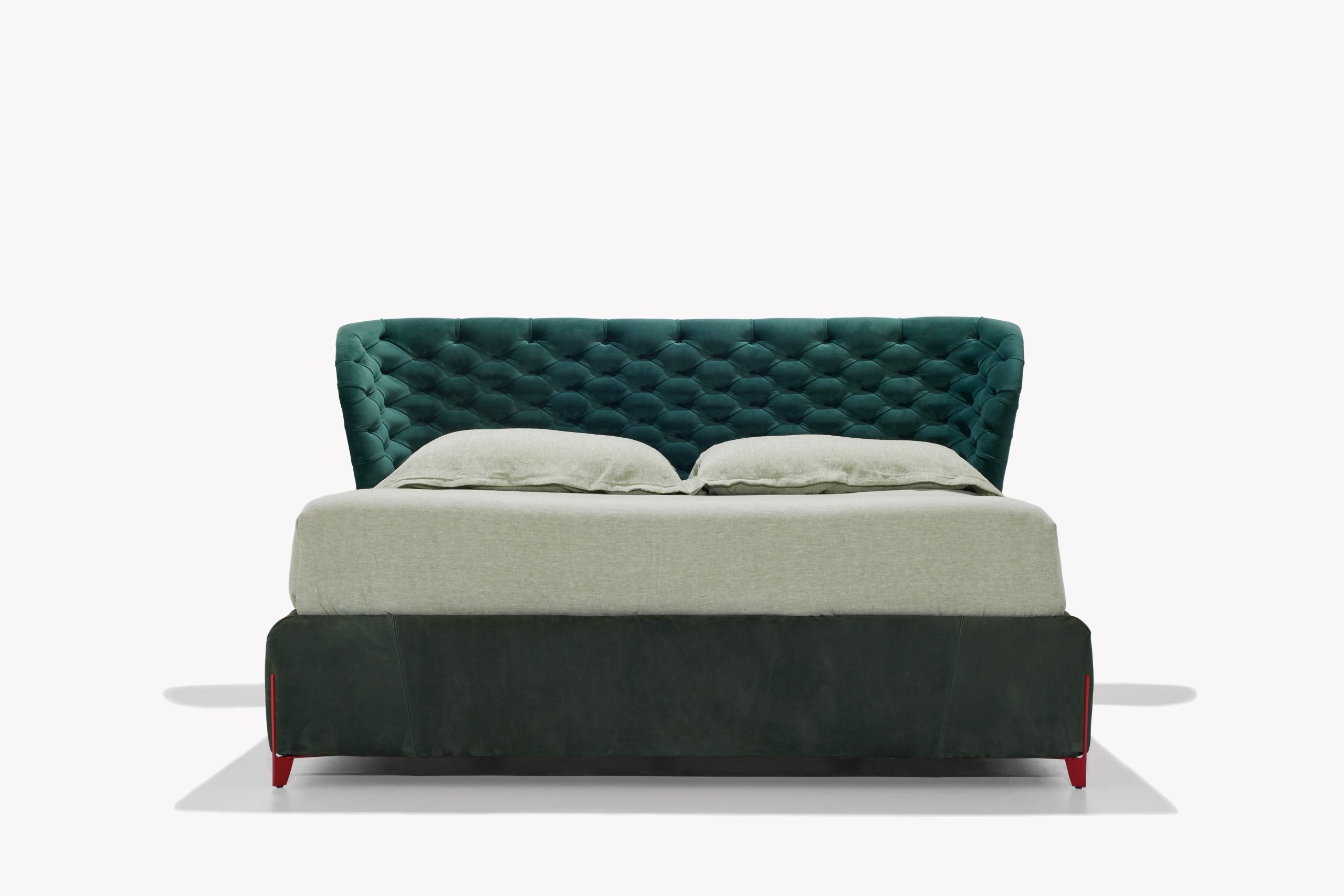 Spostandosi verso un’eleganza che sfida il tempo, incontriamo Culto, un vero manifesto di stile che si impone nella stanza grazie alla sua maestosa testata curva. La sua particolarità risiede nella lavorazione capitonné priva di bottoni, un raffinato motivo a rombi frutto di ben seicento minuti di meticolosa dedizione artigianale che riesce a bilanciare perfettamente tradizione e sensibilità contemporanea. L’esperienza tattile è arricchita da dettagli sartoriali come i profili bicolore e l’impiego di materiali nobili quali lana e pelle, mentre i piedi in metallo con fregi lavorati a laser aggiungono un accento moderno. Disponibile in sei diverse finiture metalliche, dallo champagne al rosso rubino, Culto può integrare anche una pratica base contenitore, unendo così una scenografica presenza estetica alla massima funzionalità.