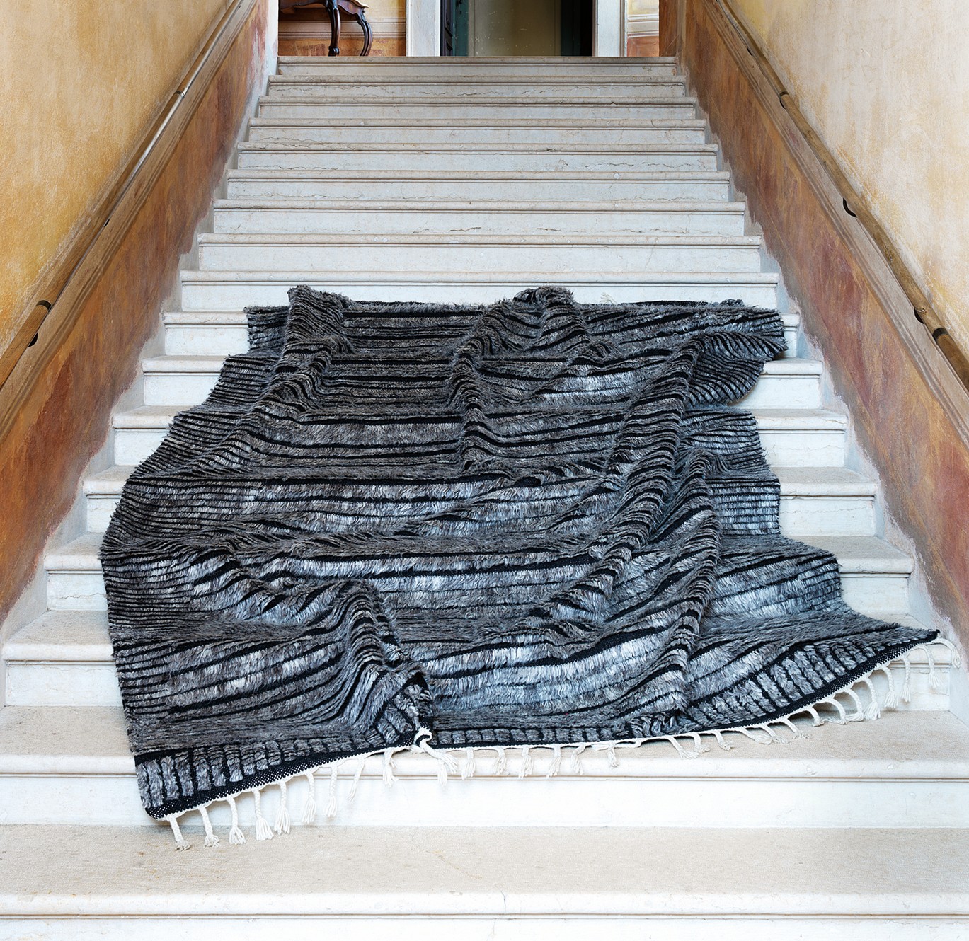 A completare la collezione ci sono i Nomad Dune, caratterizzati da un vello particolarmente lungo e da frange laterali. Il movimento naturale del pelo crea effetti morbidi e ondulati, quasi a riprodurre le dune di sabbia modellate dal vento nel deserto. Realizzati anch’essi in Lana Nuova Zelanda e Cotone, i Nomad Dune sono proposti in quattro tonalità, tra cui Naturale, Blu Notte e Rosa/Grigio. Tutti i modelli sono generalmente disponibili nel formato standard (a seconda del modello, 250×300 cm o 180×240 cm) oppure realizzabili su misura.