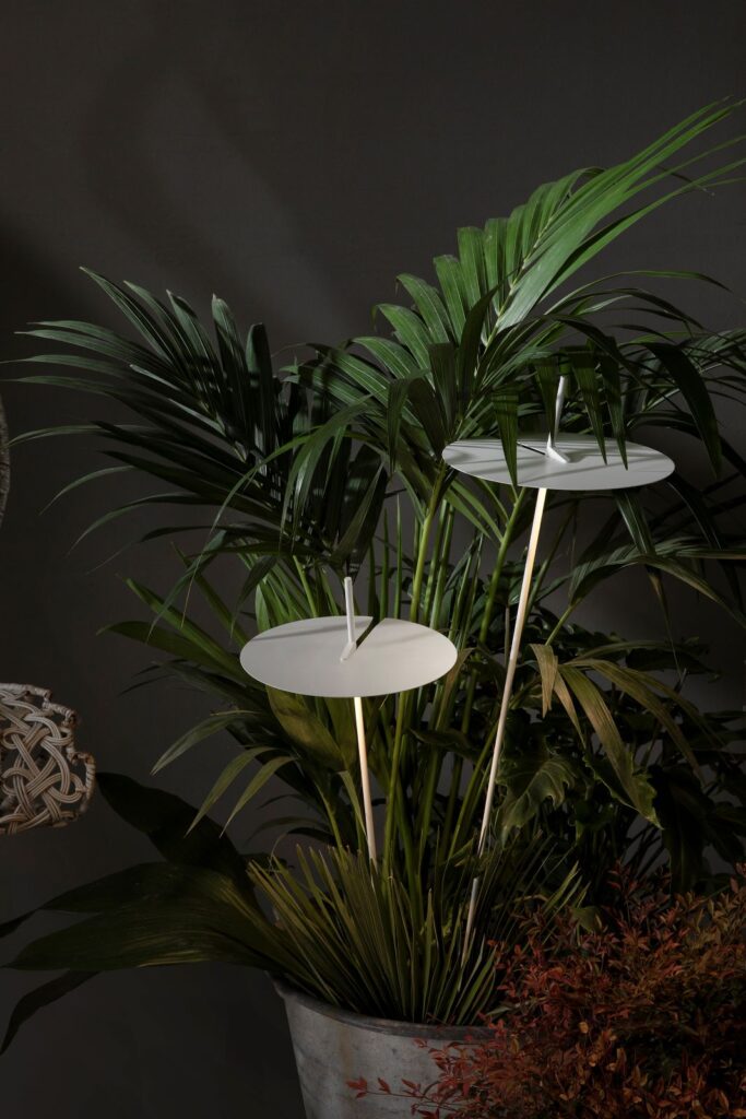 Disponibile in bianco, il suo disco, che nasconde la fonte luminosa a LED nella parte inferiore, ha le fattezze di una delicata foglia di ninfea; inoltre, grazie al suo stelo con picchetto in diverse altezze può illuminare percorsi all’aperto o si può piantare come un fiore tra la vegetazione del nostro terrazzo o giardino.