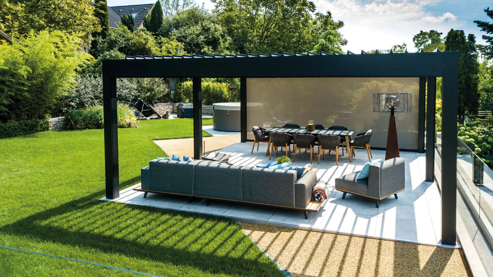 Grazie alla luce solare che penetra da ogni angolo e al rilassante living all’aperto, questo angolo della villa diventa la location perfetta per trascorrere piccoli momenti di relax in totale privacy. Varia è stata infatti accessoriata con chiusure laterali selezionate nell’ampia gamma Gibus per offrire la massima riservatezza, proteggere dal Sole e dal vento e impedire l’ingresso degli insetti. Si tratta delle schermature Click Zip, perfettamente integrate nella struttura e realizzate con un tessuto dalla trama fitta, adatta a creare un ambiente intimo e piacevole.