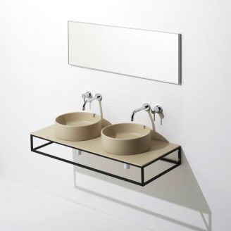 Folio è realizzata in ceramica, ha un piano davvero sottile, pari a soli 0,8 cm ed è disponibile in varie dimensioni per potersi adattare a ogni ambiente. Il lavabo può essere rotondo, ovale, quadrato o rettangolare. Le consolle, invece, poggiano su strutture in metallo nero matt, sospese o da appoggio, della stessa misura del piano, e possono essere integrate da vari elementi a giorno, cassetti push to open e pannelli laterali colorati, coordinati con le tante tonalità della ceramica, così da dare vita a infiniti e funzionali sistemi d’arredo.