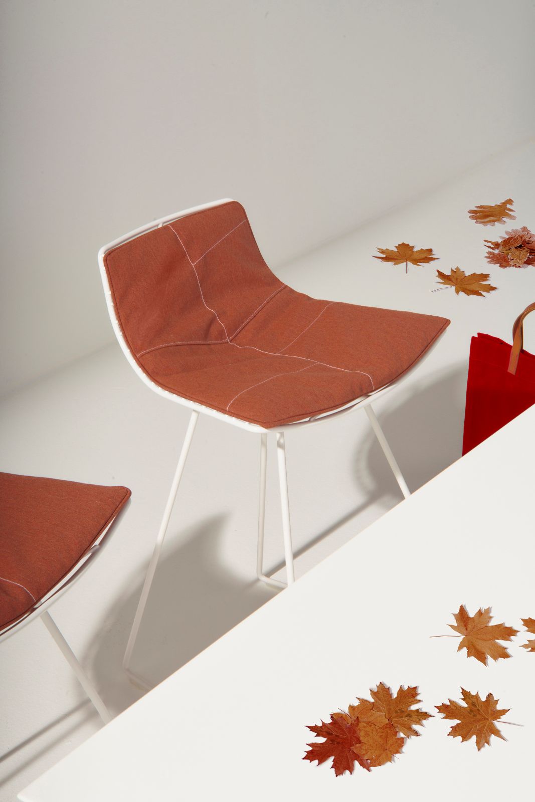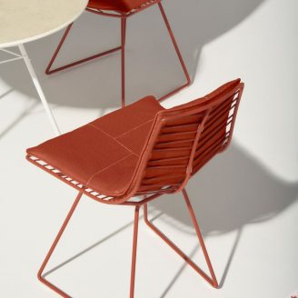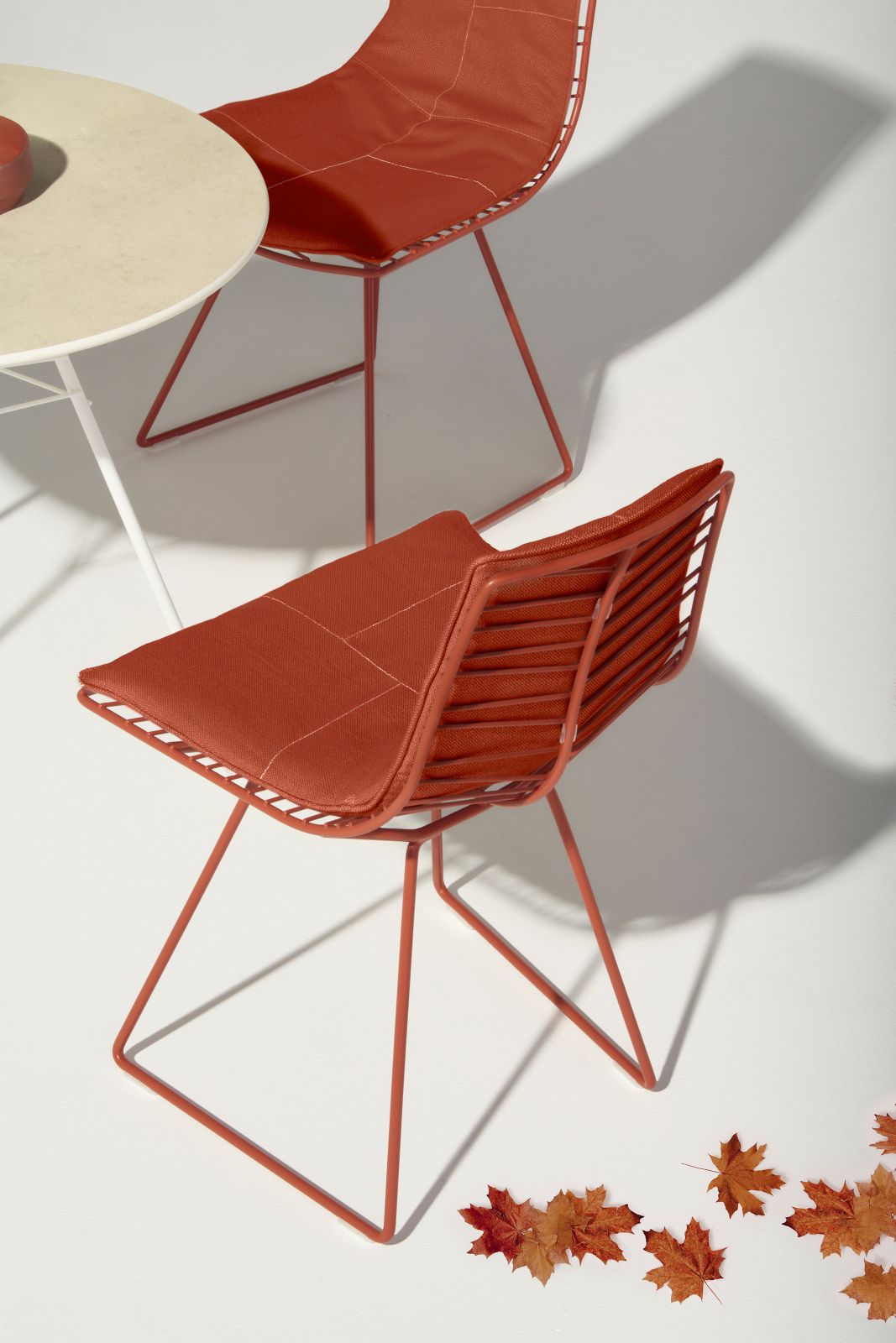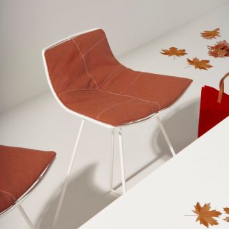 L’atmosfera autunnale è perfettamente catturata anche dalle nuove opzioni di personalizzazione. Oltre ai colori moka, verde e bianco, la palette è stata arricchita con l’introduzione del colore ruggine, che, insieme alle cuciture decorative nelle quattro tonalità disponibili, amplifica notevolmente le possibilità di abbinamento tra sedie, tavoli e cuscini.