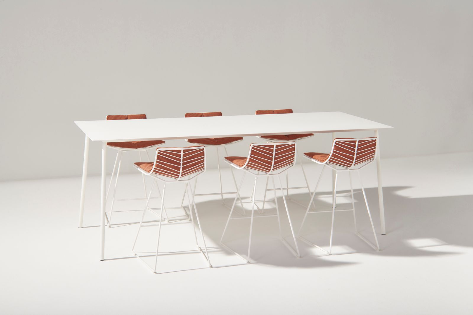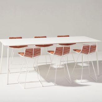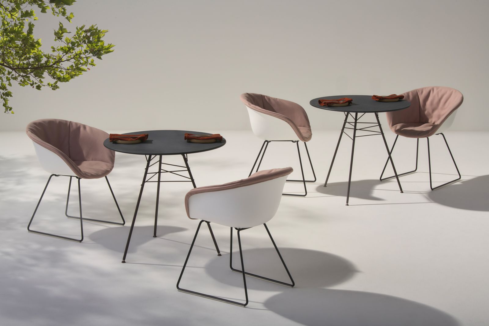 Anche i tavoli Leaf (disponibili in H 50 e 74 cm) si adattano alla stagione e a nuovi utilizzi. Le nuove finiture effetto pietra dei piani in HPL a tutto spessore ne migliorano l’aspetto naturale. Questa matericità e tattilità rendono i tavoli ideali per un uso piacevole anche senza tovaglia. Grazie all’introduzione di due nuove dimensioni di piano più grandi (Ø 128 cm e Ø 158 cm) con basi a quattro gambe, i tavoli, già ideali per situazioni lounge, si adattano ora pienamente anche a usi dining in spazi esterni.