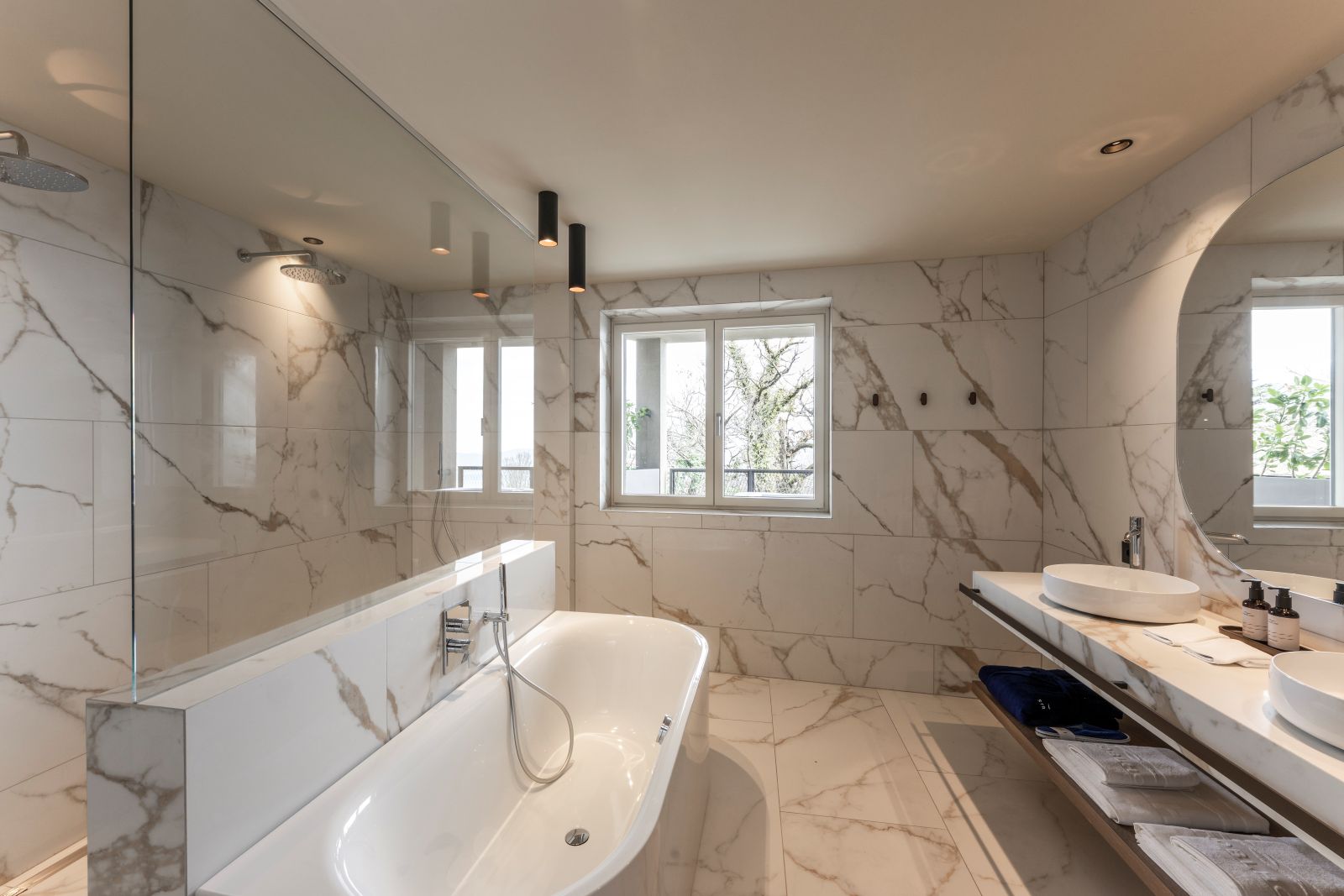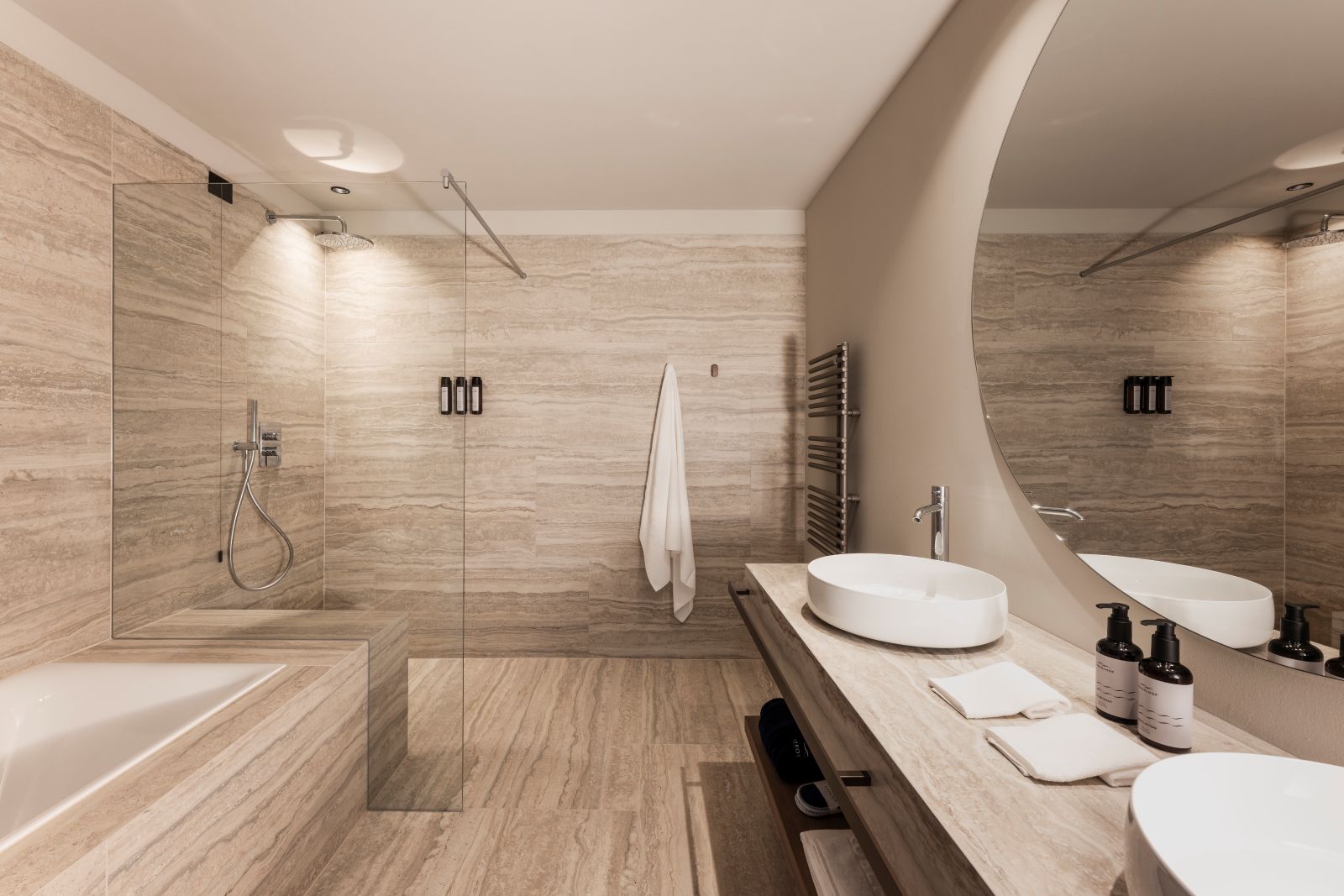 Protagonista indiscussa del progetto è la collezione Noblesse. Selezionata nella raffinata nuance Calacatta Oro, definisce le superfici delle Family Suite e del Family Chalet, conferendo loro un’eleganza classica e intramontabile.