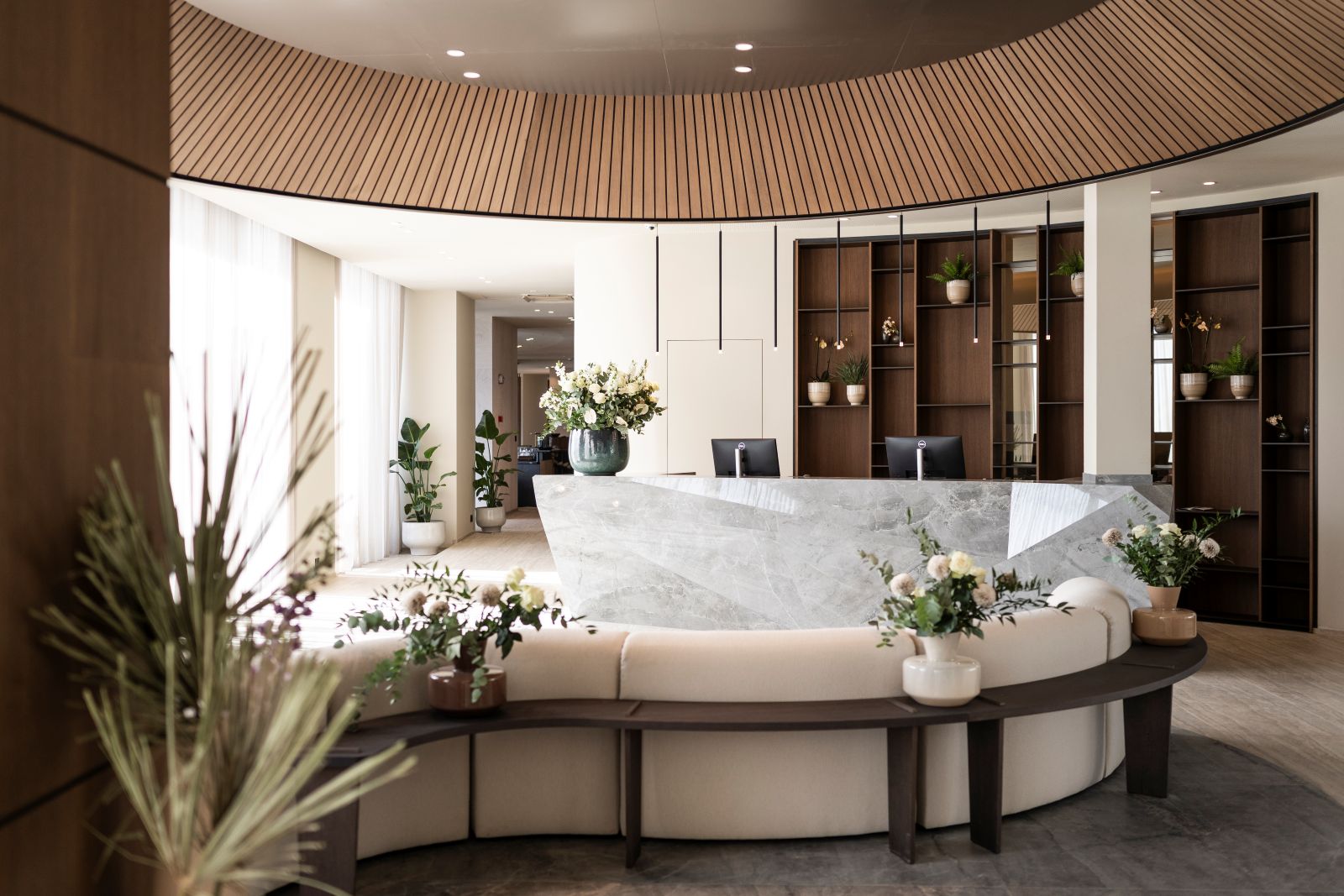 La stessa collezione, ma nella variante Gray Marble, scandisce il ritmo della lobby. In questo spazio, le grandi e sottili lastre Slimtech interpretano la monumentalità tipica del marmo in una chiave moderna. Il risultato è un’idea di lusso essenziale, che si manifesta attraverso la leggerezza e la continuità visiva.