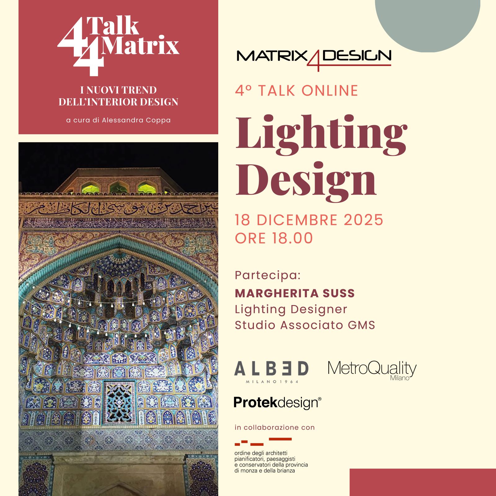 Il talk è realizzato con il sostegno di Albed, Metroquality e Protekdesign in collaborazione con l’Ordine Architetti PPC Monza che assegnerà 4 CFP agli architetti partecipanti a tutti e quattro gli appuntamenti della rassegna 4TALK4MATRIX. Per seguire la diretta occorre registrarsi gratuitamente a questo link. Non mancate!