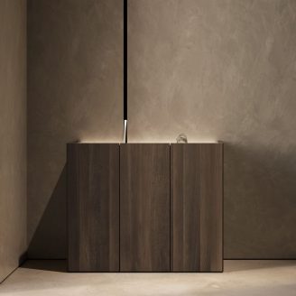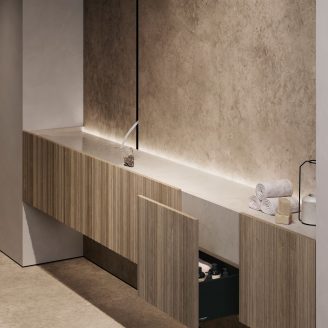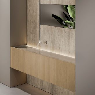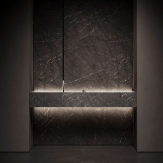 La luce gioca anch’essa un ruolo da protagonista, sempre presente nella parte superiore per delineare i contorni e creare un’atmosfera unica. È possibile integrare l’illuminazione anche nella parte inferiore quando il lavabo è privo di mobile.