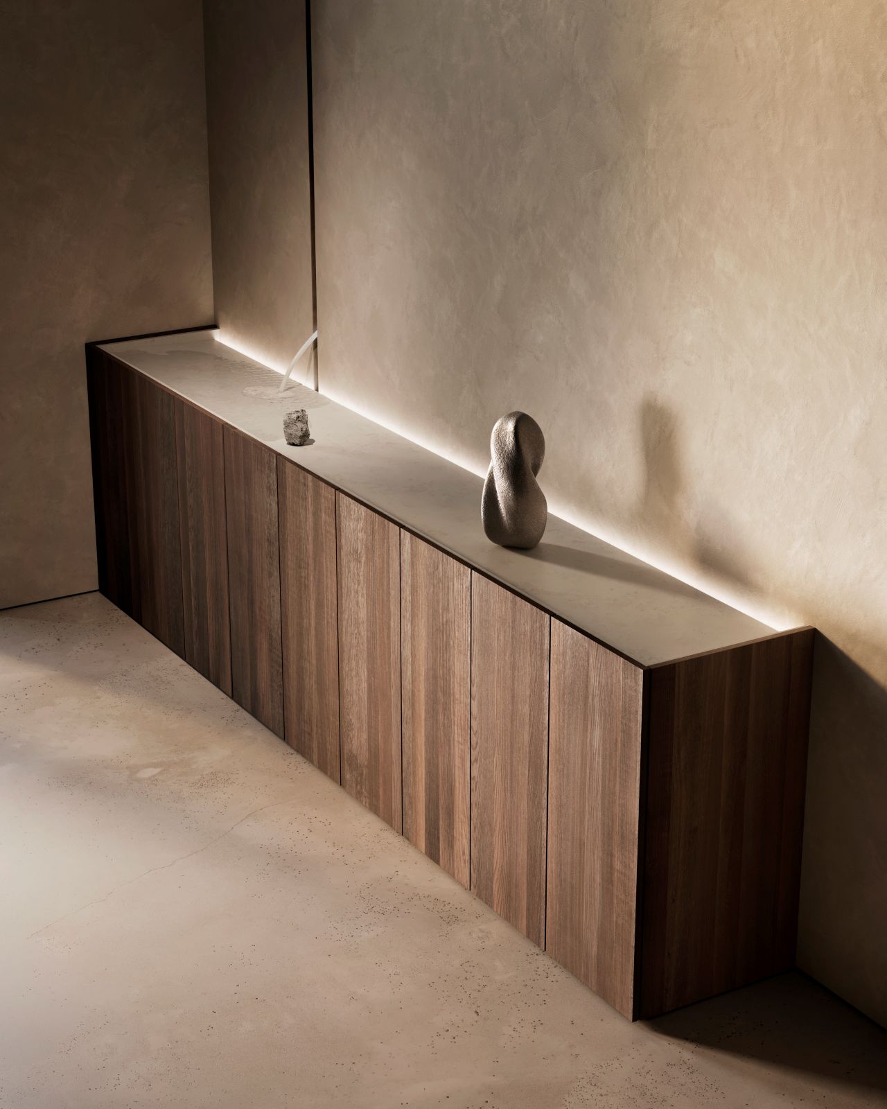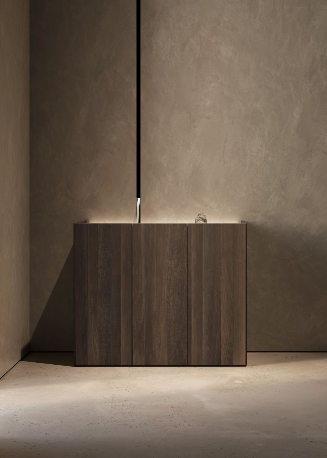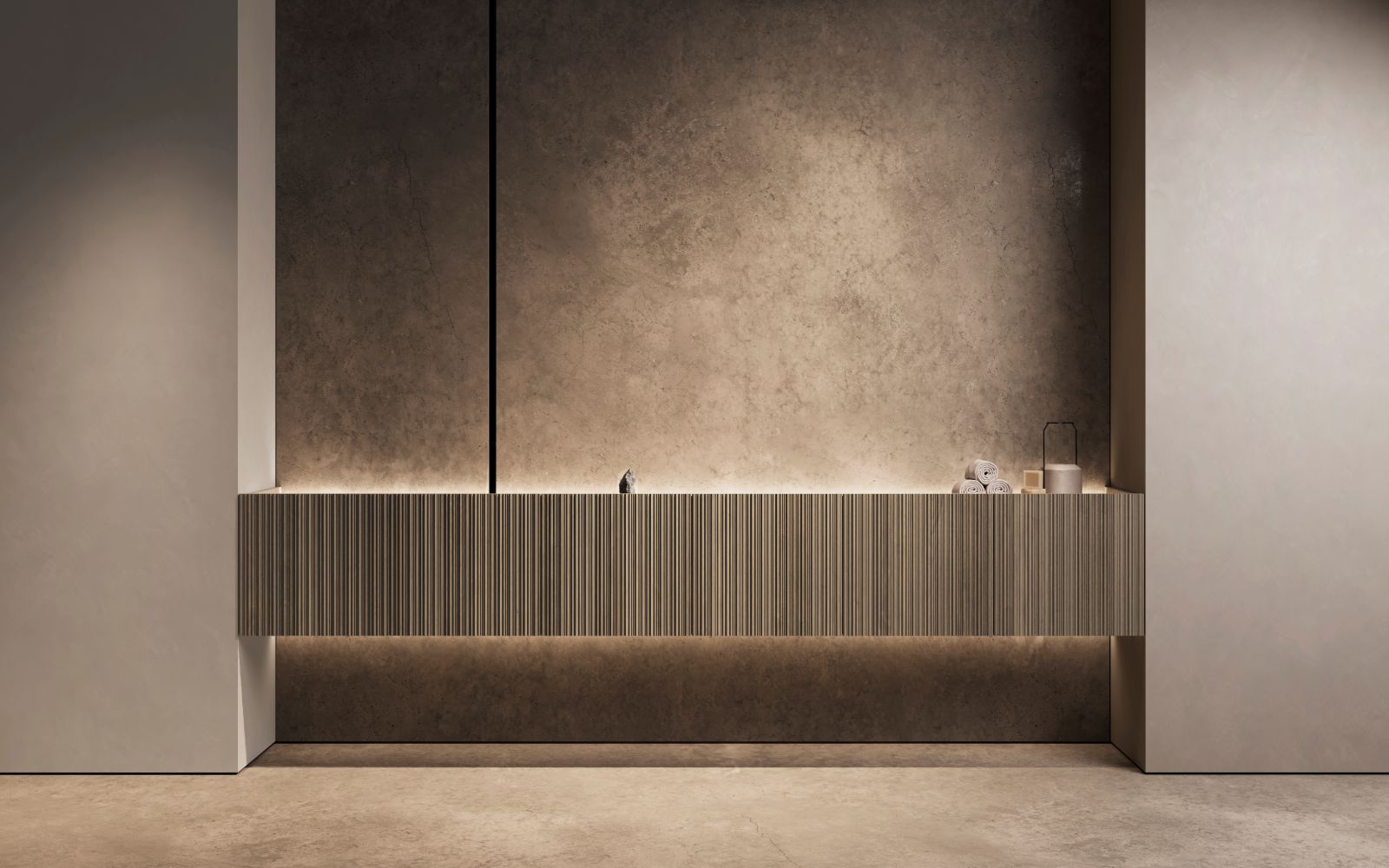 Il sistema si basa su un taglio netto e architettonico nella parete. Questo segno essenziale nasconde la canna del rubinetto, rendendo il miscelatore invisibile. La parete stessa si trasforma così in una fonte, da cui l’acqua sgorga con potenza e purezza, rompendo la staticità delle composizioni tradizionali.