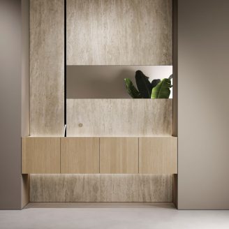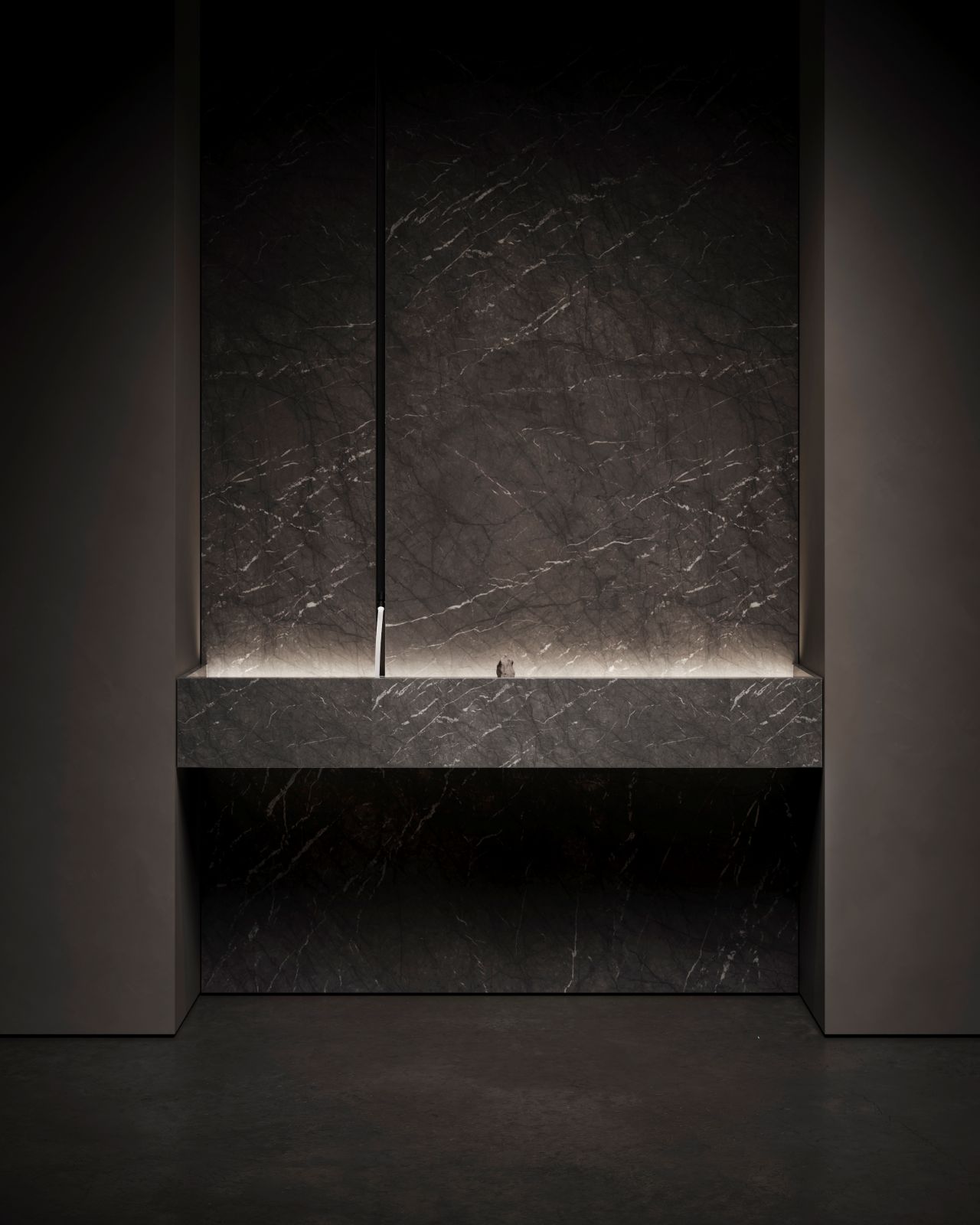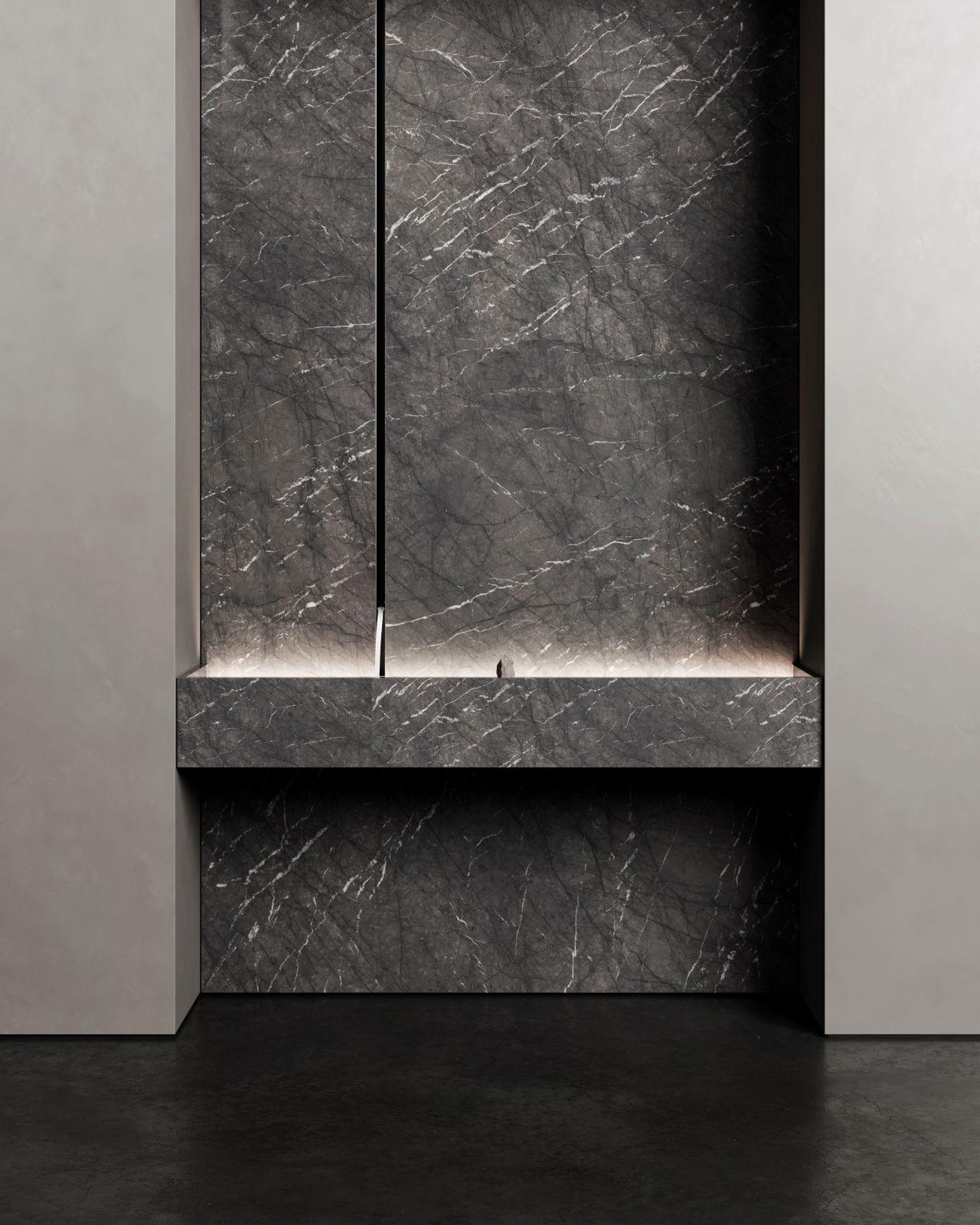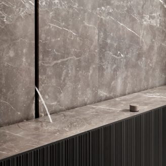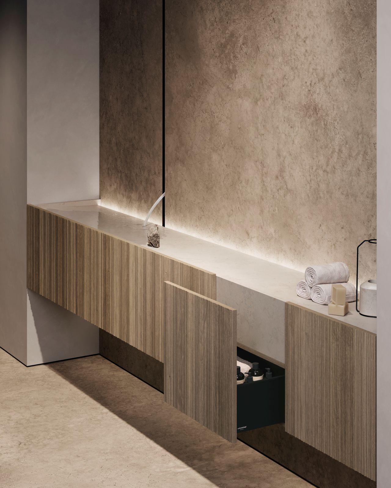 Dettagli scultorei rafforzano il legame con l’origine: un sasso di marmo emerge dal lavabo fungendo da manopola progressiva per la regolazione dell’acqua. Questo elemento unisce estetica e funzionalità, richiamando la connessione primordiale tra uomo e natura.