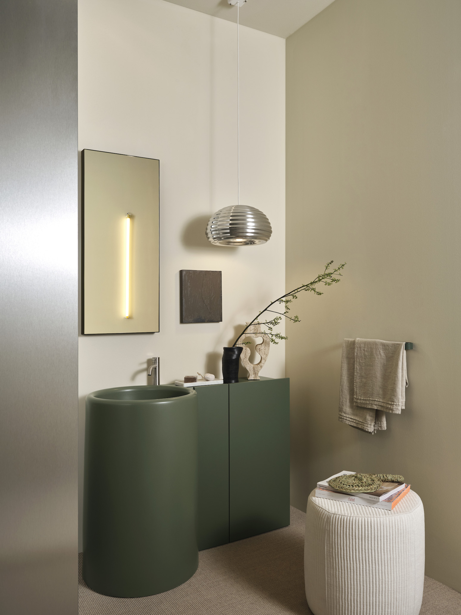 Al centro della collezione si staglia il lavabo freestanding dalla geometria cilindrica, un volume scultoreo di forte impatto estetico che può essere integrato a mobili contenitori in legno realizzati su misura. Queste soluzioni d’arredo mantengono un design essenziale e funzionale, studiato per ottimizzare gli ingombri senza rinunciare alla solidità della presenza materica. La bacinella ovale arricchisce ulteriormente la proposta, offrendo versatilità d’uso sia nella versione da appoggio che in quella freestanding, qualora installata sulla propria colonna dedicata.