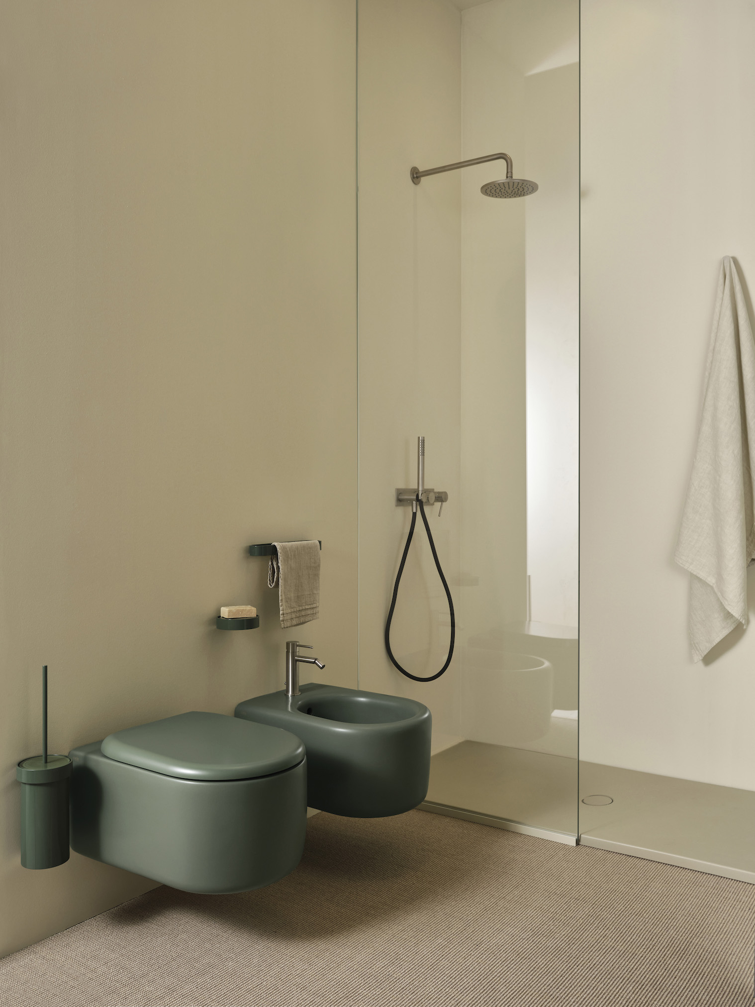 Le forme primordiali degli elementi si distaccano dai volumi murari per abitare lo spazio come monoliti indipendenti, pur integrandosi con armonia nell’architettura globale. Questo equilibrio è garantito dall’ampia selezione di smalti lucidi e opachi che attingono alle ricercate palette Terre di Cielo, Acque di Cielo ed Essential Colors. La serie viene completata da una coppia di sanitari, declinati nelle versioni sospesa o a terra, che ribadiscono la centralità della materia.