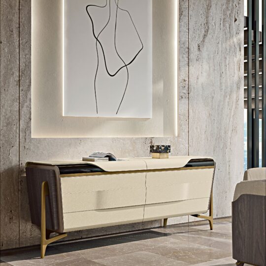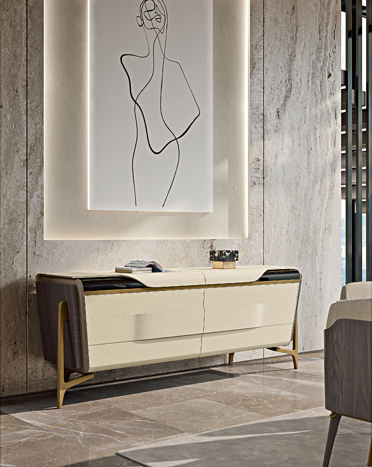 Lo stesso dettaglio oro è riproposto sulle credenze, disponibili con ante scorrevoli e vano superiore a ribalta – con rivestimento in pelle o in noce naturale – o con ante battenti e top in marmo; anche il design del mobile TV predilige le linee oblique: qui la parte frontale presenta cassetti rivestiti in pelle, ai lati sono alloggiati due contenitori estraibili e le gambe inclinate sono ancora una volta realizzate in metallo oro spazzolato.