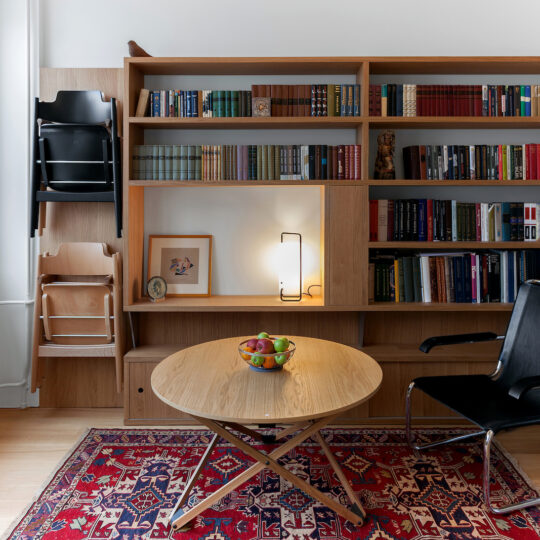 Ben illuminato dalla luce naturale che filtra tra i palazzi del centro storico cittadino, il Mini Flat Moscow si distingue innanzitutto per l’angolo lettura: tra i libri disposti su una mensola spaziosa, svolge qui un ruolo da protagonista la poltroncina club S 35 disegnata da Marcel Breuer per Thonet, orientata verso il panorama all’esterno.