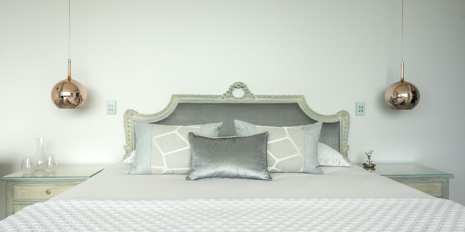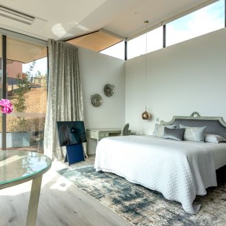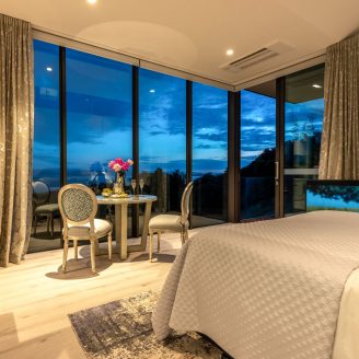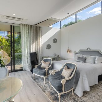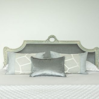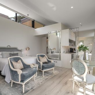 All’interno di Villa Surrender, l’ambiente è impreziosito da una testata letto king-size rivestita in velluto cangiante grigio, e da comodini e una scrivania della collezione Mozart in stile Luigi XVI. Questi elementi sono stati rifiniti in laccato avorio bianco spelato su fondo grigio. La composizione include anche poltroncine ai piedi del letto in laccato bianco con tessuto grigio e due sedie in finitura foglia argento attorno a un tavolino per la colazione realizzato su misura. Le linee sobrie degli arredi Luigi XVI, unite a finiture leggere e colorazioni che richiamano l’oceano, creano un’atmosfera luminosa e accogliente, ideale per il relax.